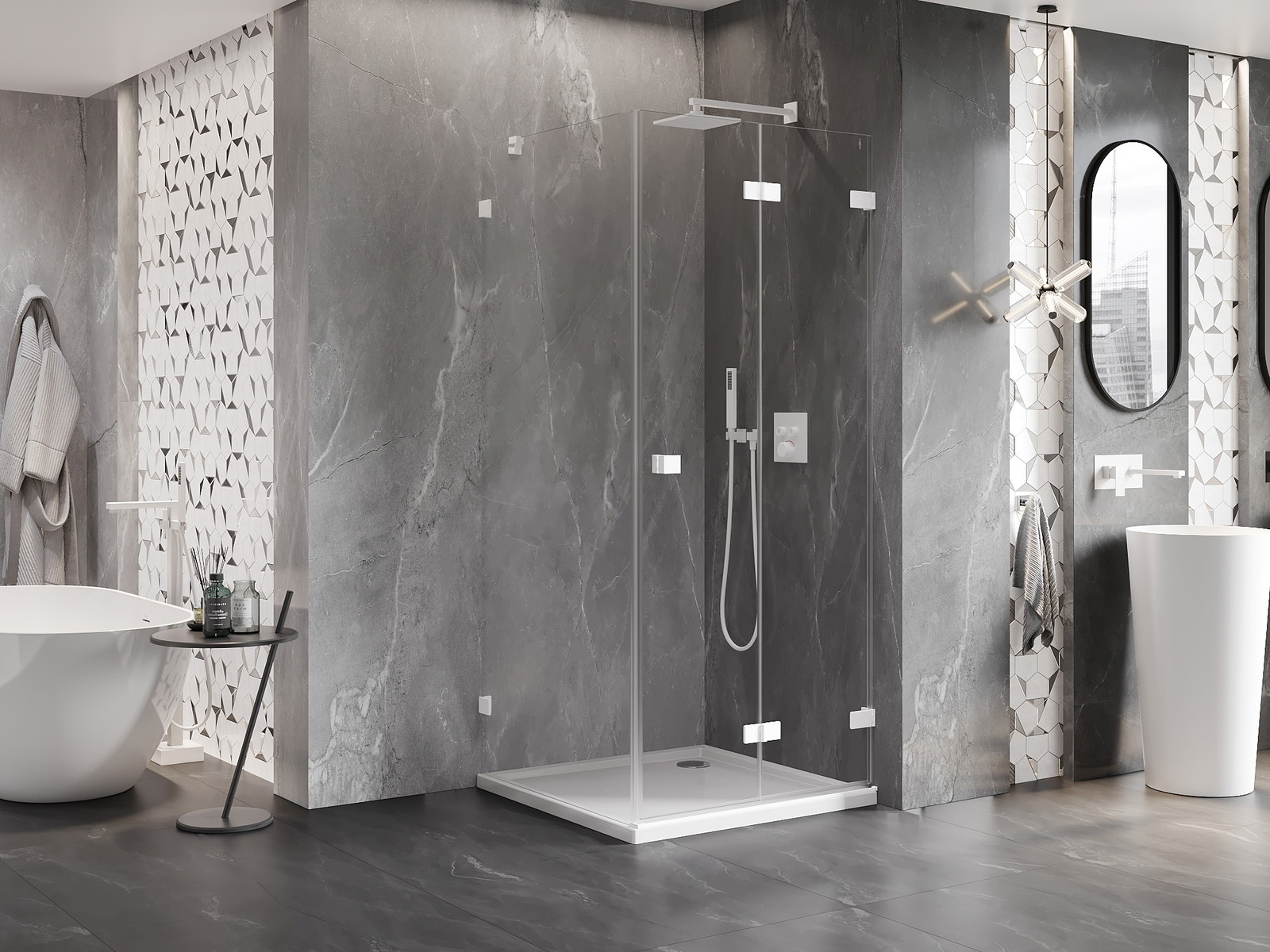 Galimybė sulenkti duris, tiek į išorę, tiek į vidų, leidžia gauti daugiau erdvės nenaudojant dušo. Tai yra idealus sprendimas mažesnėms vonios kambariams, maksimaliai išnaudojantis turimą plotą.