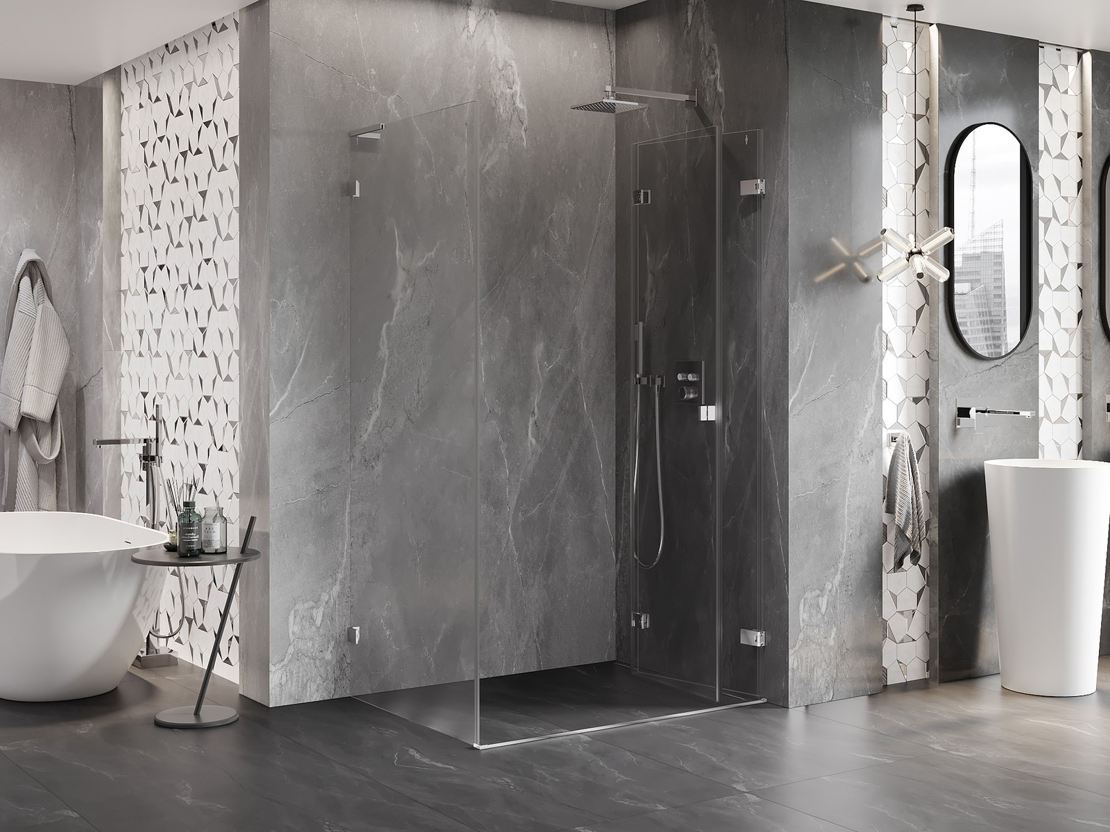 Galimybė sulenkti duris, tiek į išorę, tiek į vidų, leidžia gauti daugiau erdvės nenaudojant dušo. Tai yra idealus sprendimas mažesnėms vonios kambariams, maksimaliai išnaudojantis turimą plotą.