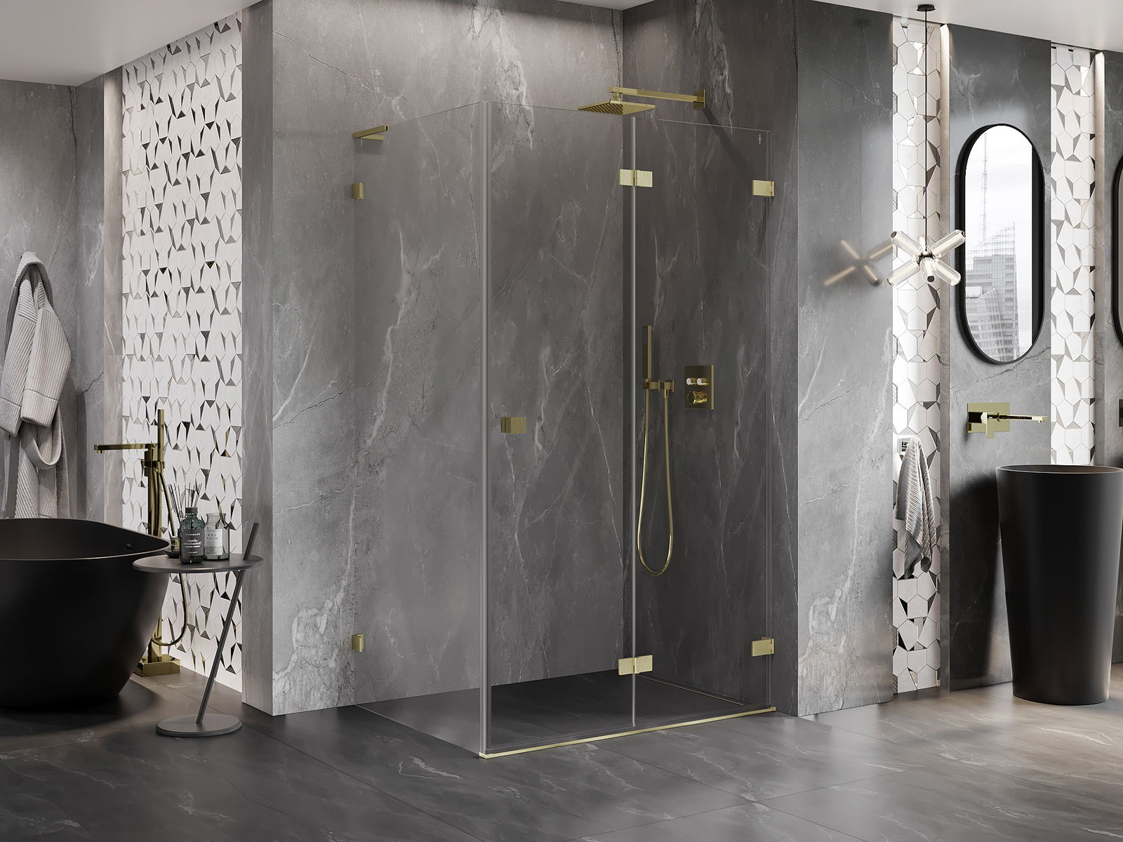 Spaustukai ir vyriai pagaminti iš labai patvaraus žalvario, papildomai sukuriantys lygią stiklo plokštumą. Tai puikus pasirinkimas, jungiantis eleganciją, patvarumą ir šiuolaikinį dizainą. Tokie sprendimai prideda dušo estetikai ir tuo pačiu palengvina švaros palaikymą.