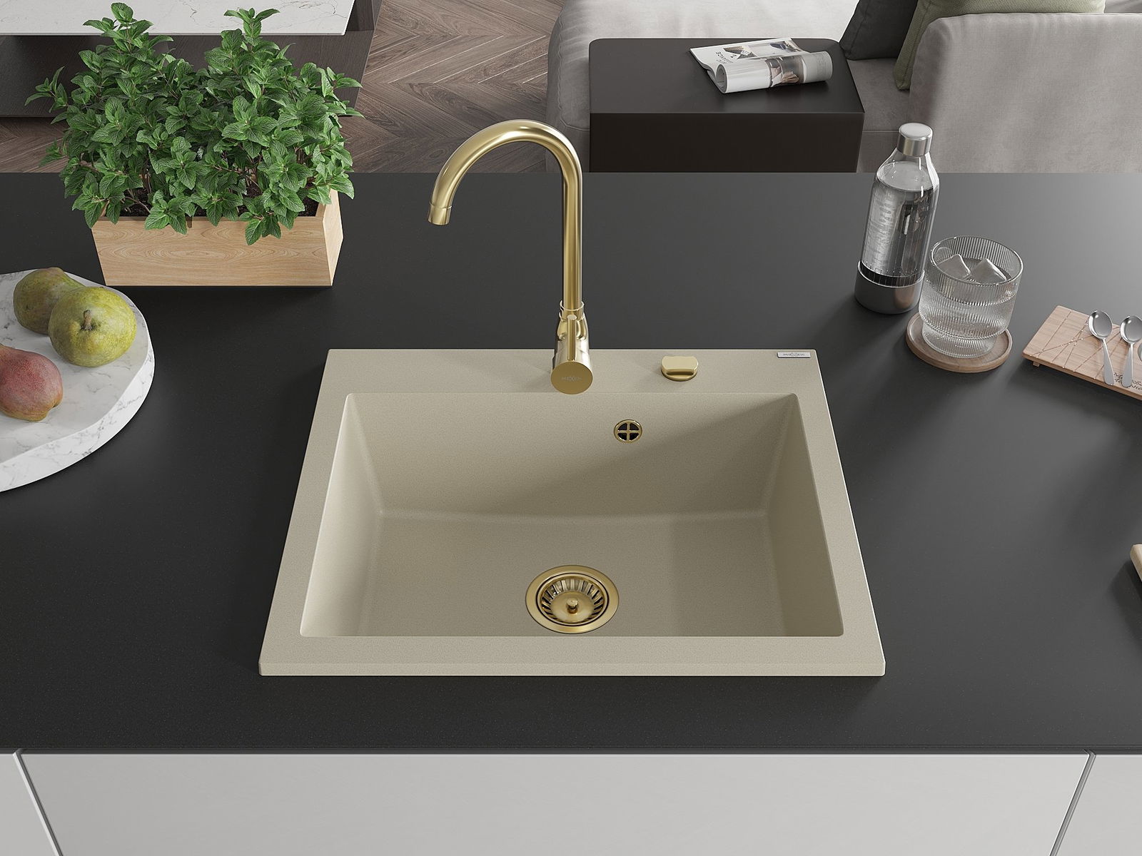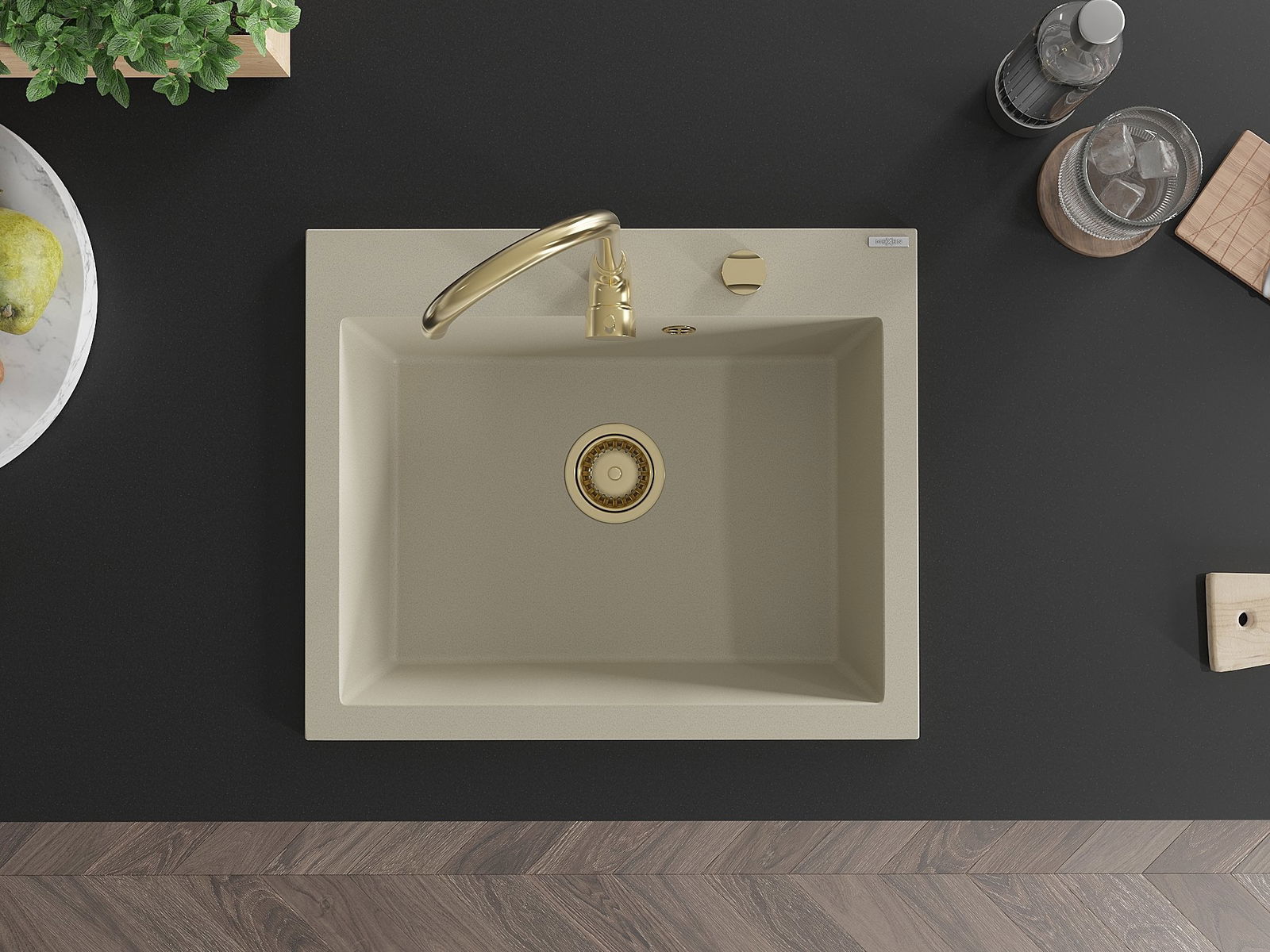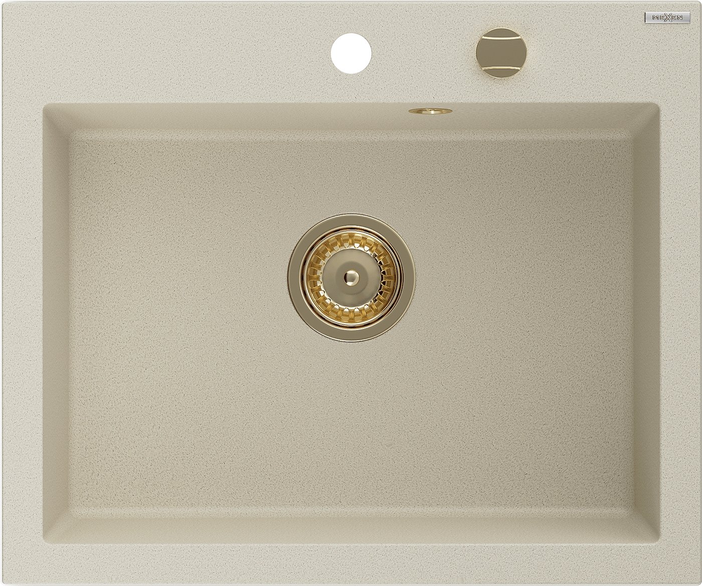 Mexen Elix granitinė virtuvės kriauklė vienos kameros 600 x 500 mm, smėlio spalvos, aukso sifonas - 6525601005-69-G