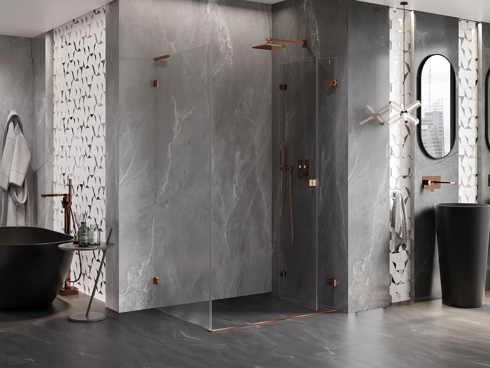 Spaustukai ir vyriai pagaminti iš labai patvaraus žalvario, papildomai sukuriantys lygią stiklo plokštumą. Tai puikus pasirinkimas, jungiantis eleganciją, patvarumą ir šiuolaikinį dizainą. Tokie sprendimai prideda dušo estetikai ir tuo pačiu palengvina švaros palaikymą.