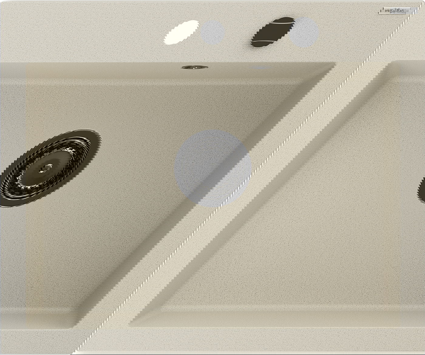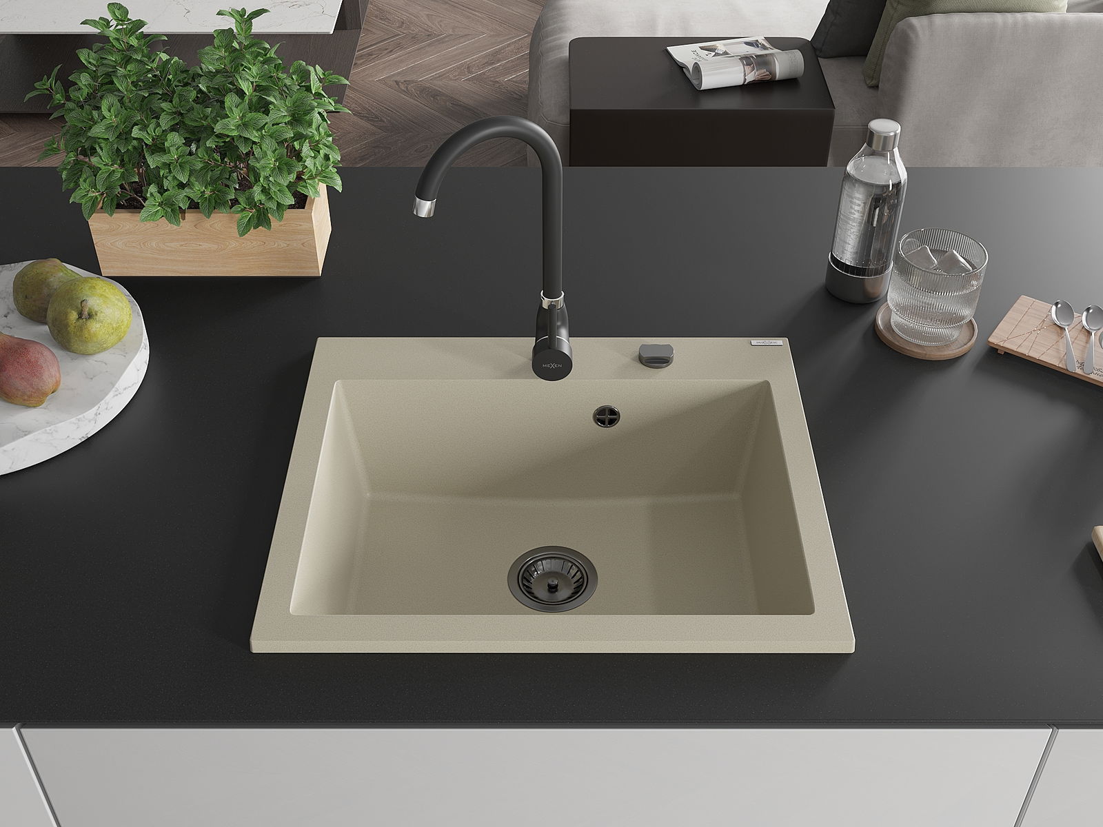 Mexen Elix granitinė virtuvės plautuvė, 1 skyrelio, 600 x 500 mm, smėlio, juodas sifonas - 6525601005-69-B