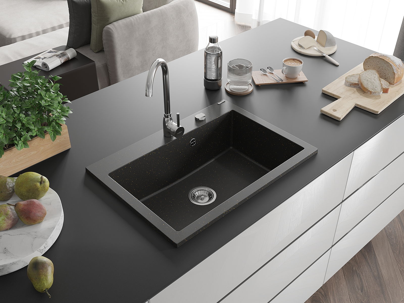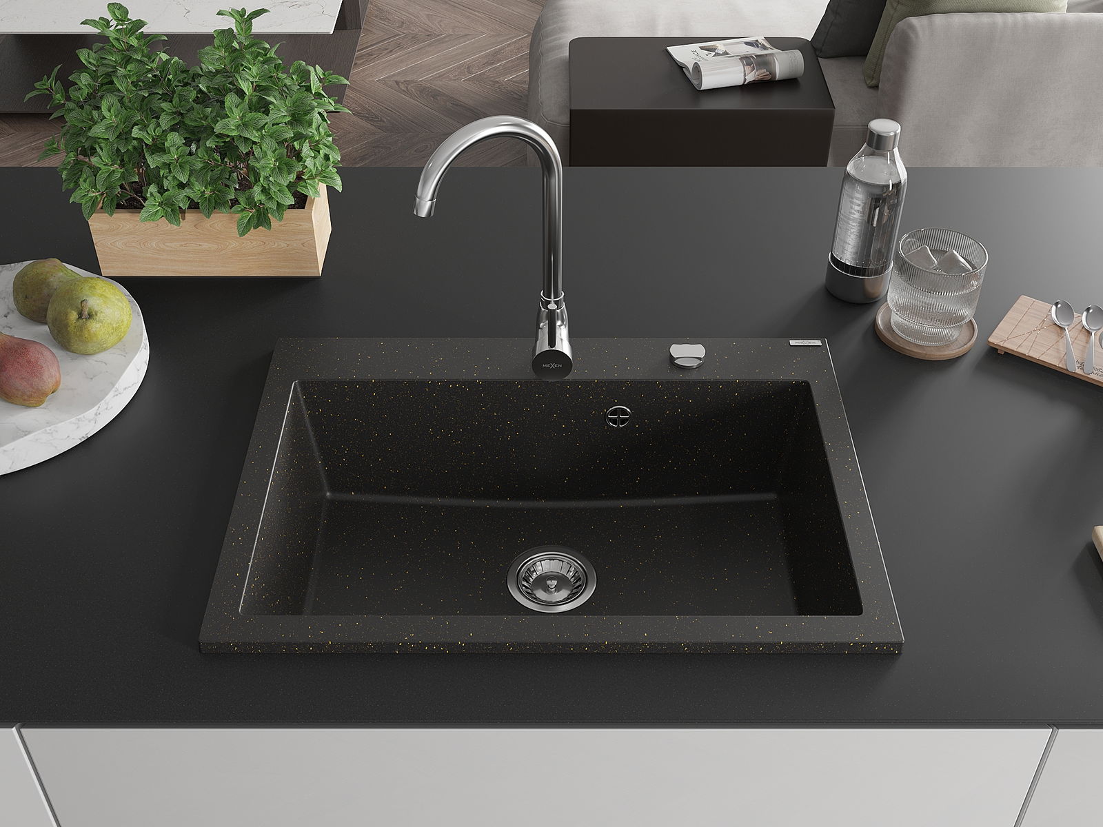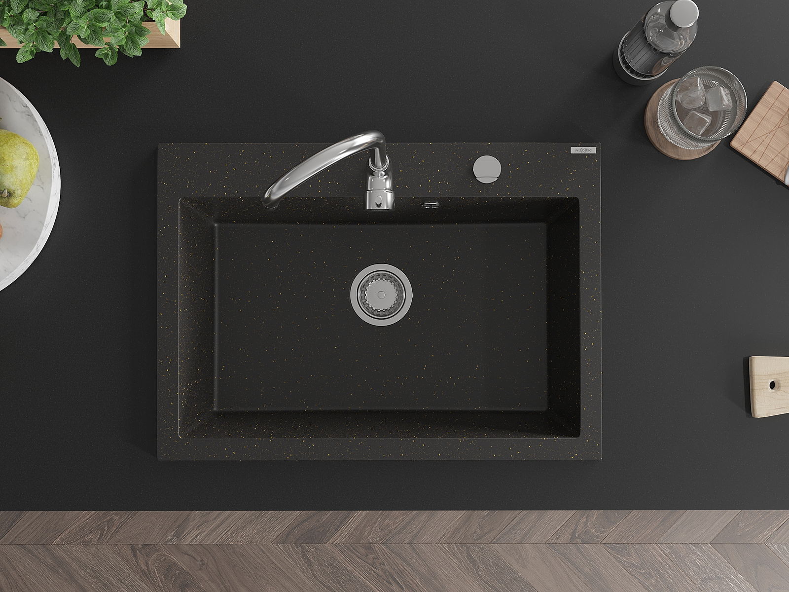 Mexen Elix granitinė vienos kameros kriauklė 700 x 500 mm, juoda/aukso metalikas, chromuotas sifonas - 6526701005-75