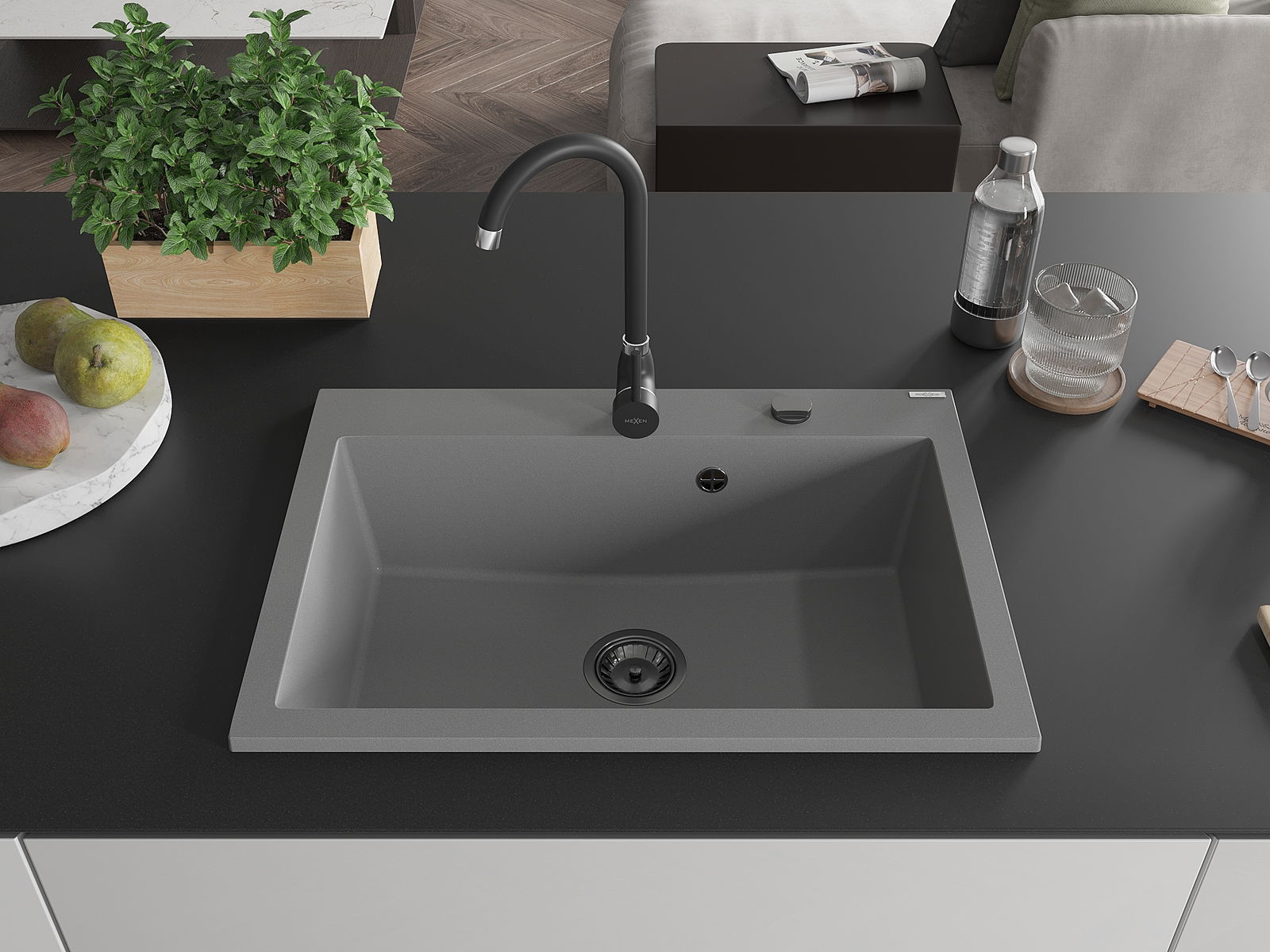 Mexen Elix granitinis virtuvės plautuvas 1-skyrius 700 x 500 mm, pilkas, juoda sifona - 6526701005-71-B