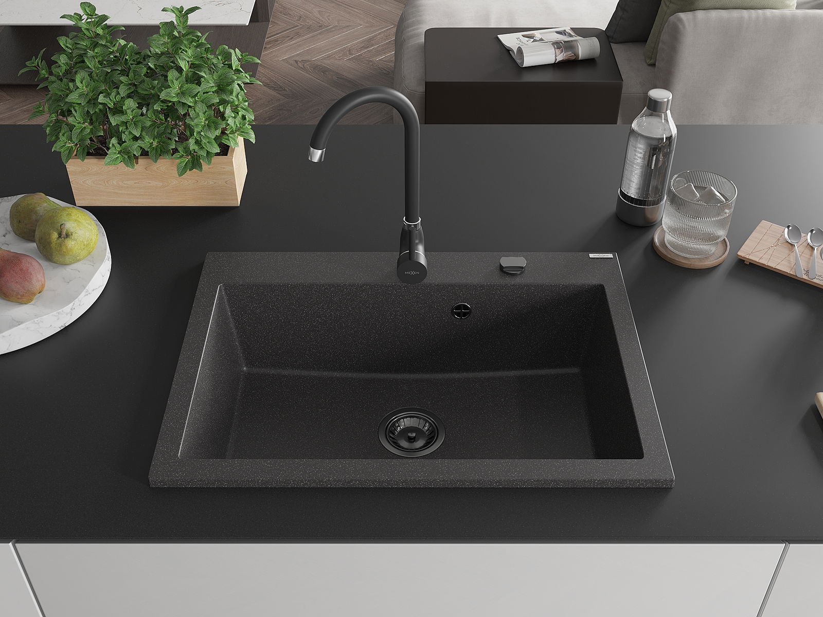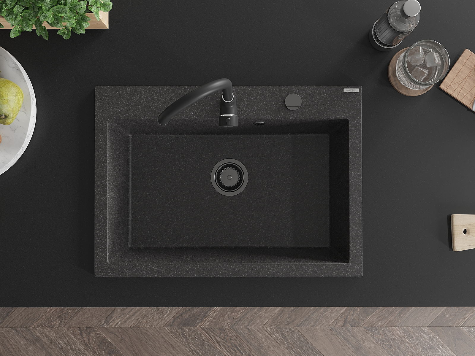 Mexen Elix granito plautuvė su viena kamera 700 x 500 mm, juoda su dėmėmis, juodas sifonas - 6526701005-76-B