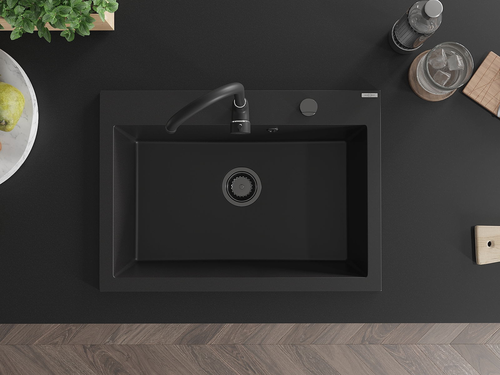 Mexen Elix granito kriauklė 1 skyrius 700 x 500 mm, juoda, juodas sifonas - 6526701005-77-B
