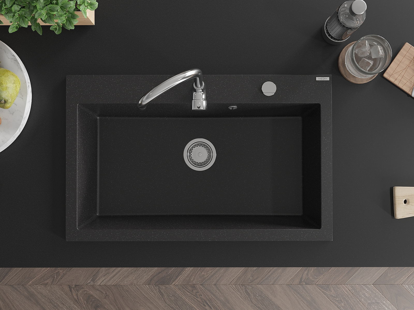 Mexen Elix granitinė vienos kameros plautuvė 800 x 500 mm, juoda/sidabrinė metalik, chromo sifonas - 6527801005-73