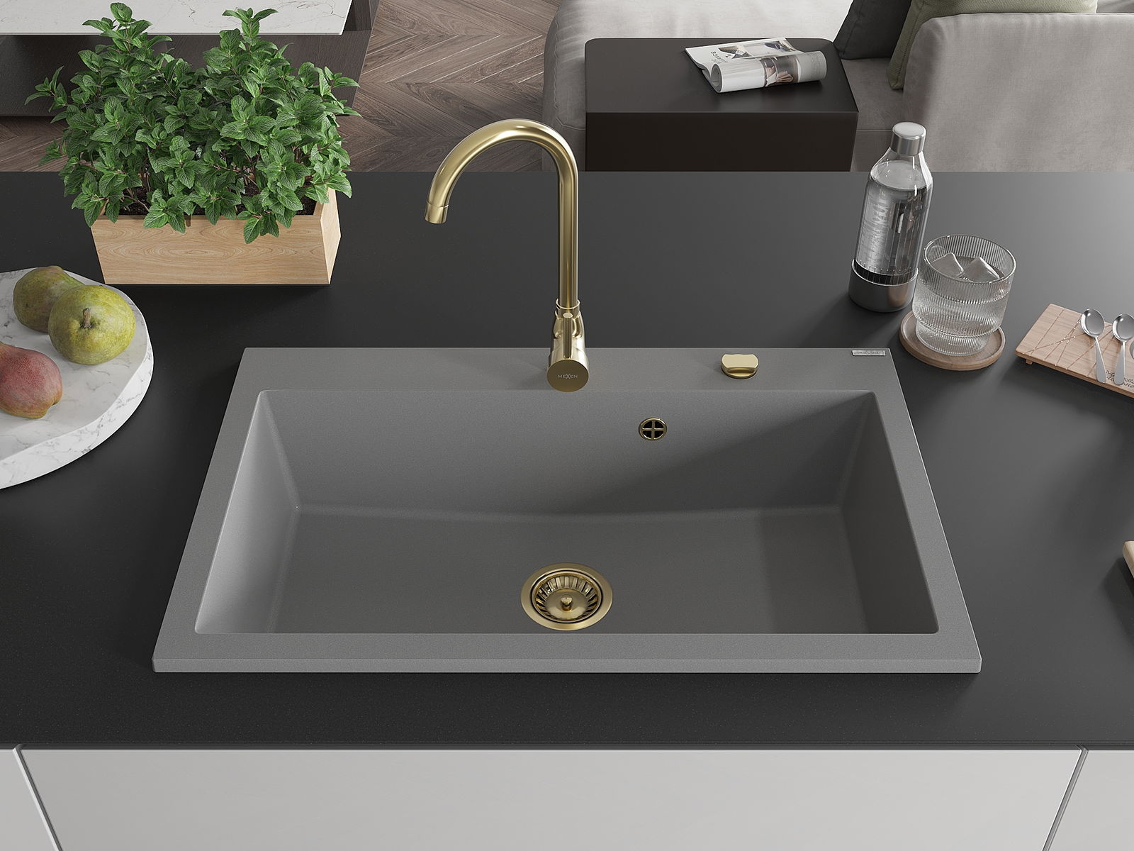 Mexen Elix granitinė vienos kameros plautuvė 800 x 500 mm, pilka, aukso sifonas - 6527801005-71-G