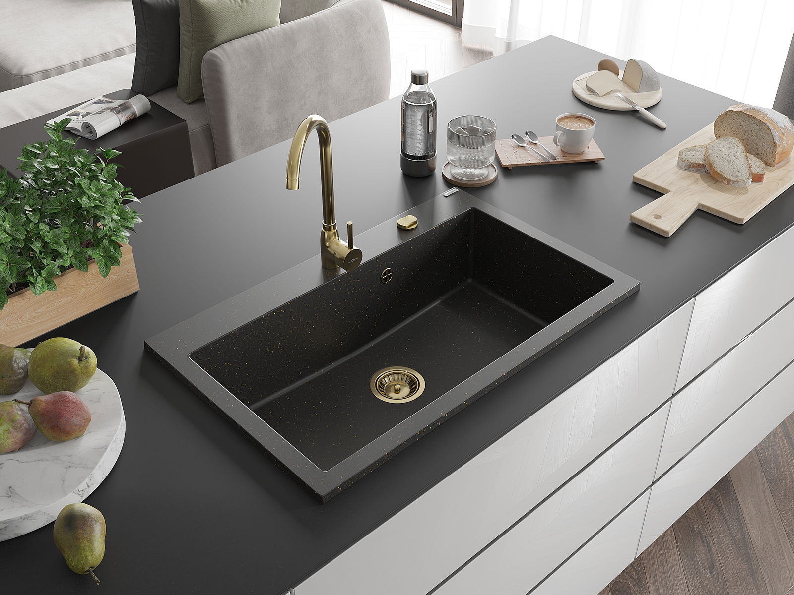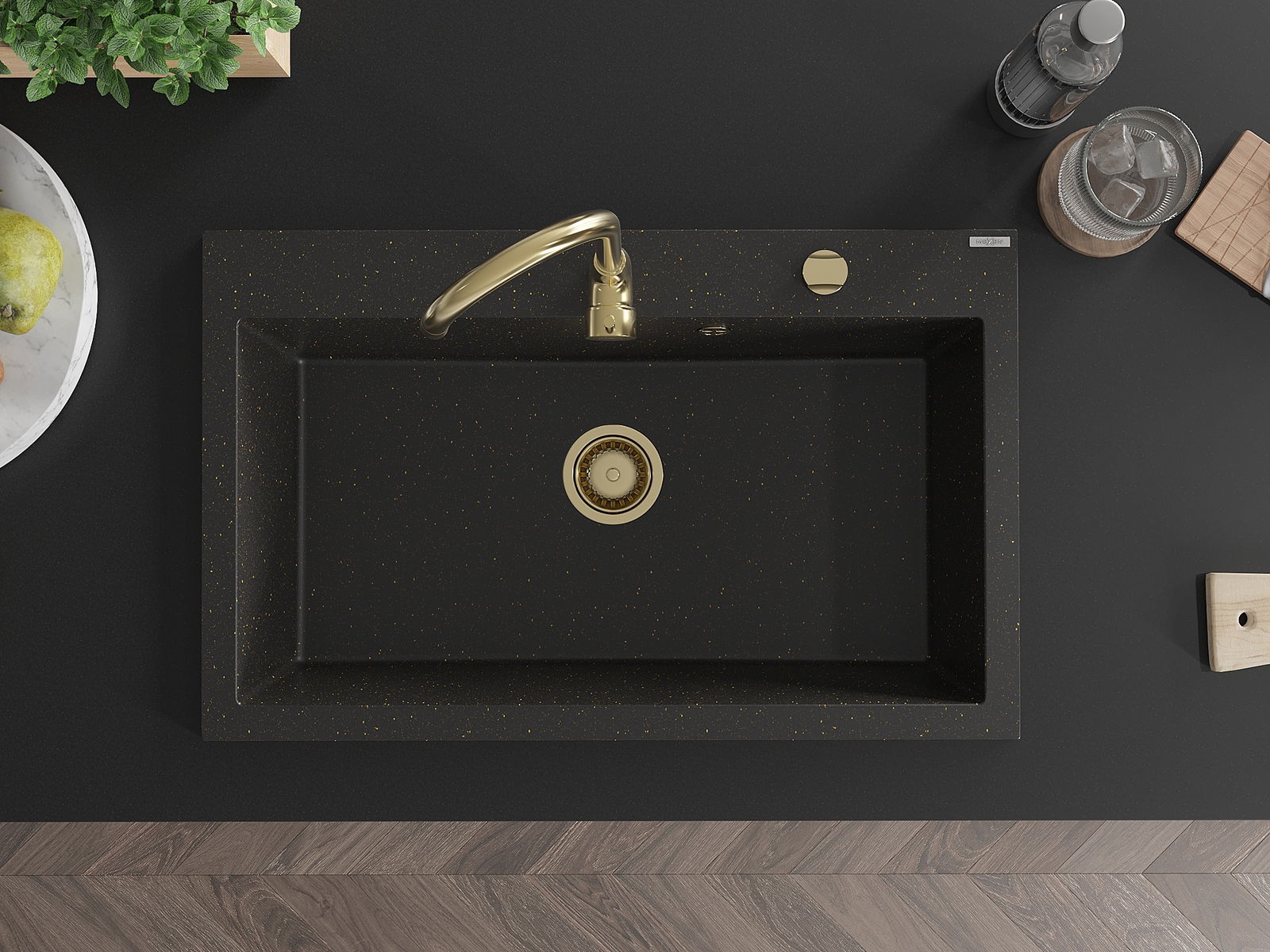 Mexen Elix granitinė vienos medžiagos plautuvė 800 x 500 mm, juoda/auksinis metalikas, auksinis sifonas - 6527801005-75-G