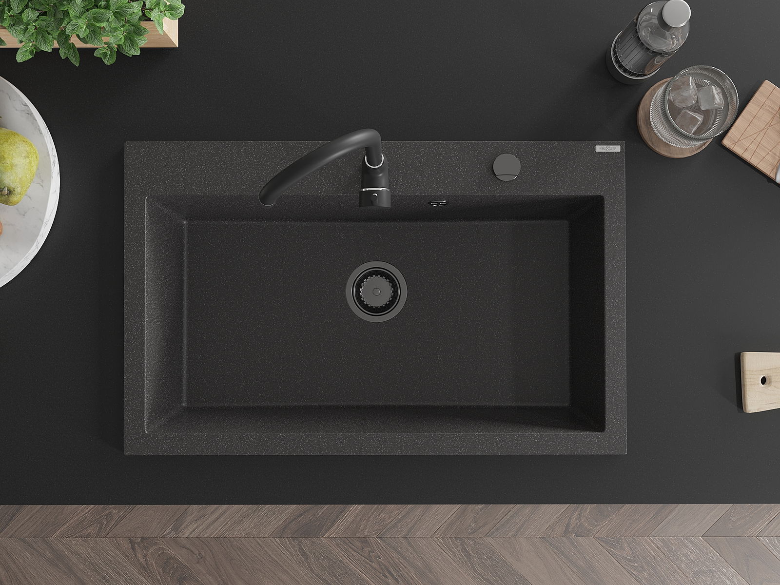 Mexen Elix granitinė plautuvė, 1 skyrius, 800 x 500 mm, juoda taškuota, juodas sifonas - 6527801005-76-B