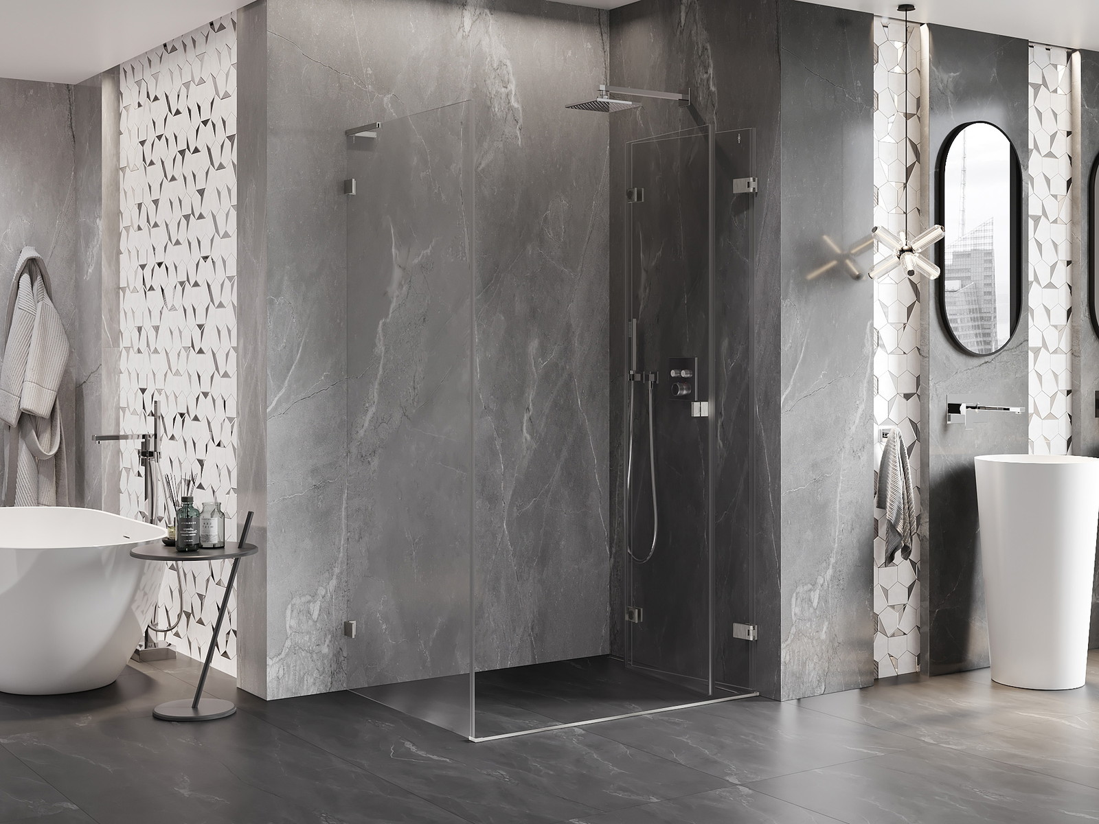 Galimybė sulenkti duris, tiek į išorę, tiek į vidų, leidžia gauti daugiau erdvės nenaudojant dušo. Tai yra idealus sprendimas mažesnėms vonios kambariams, maksimaliai išnaudojantis turimą plotą.