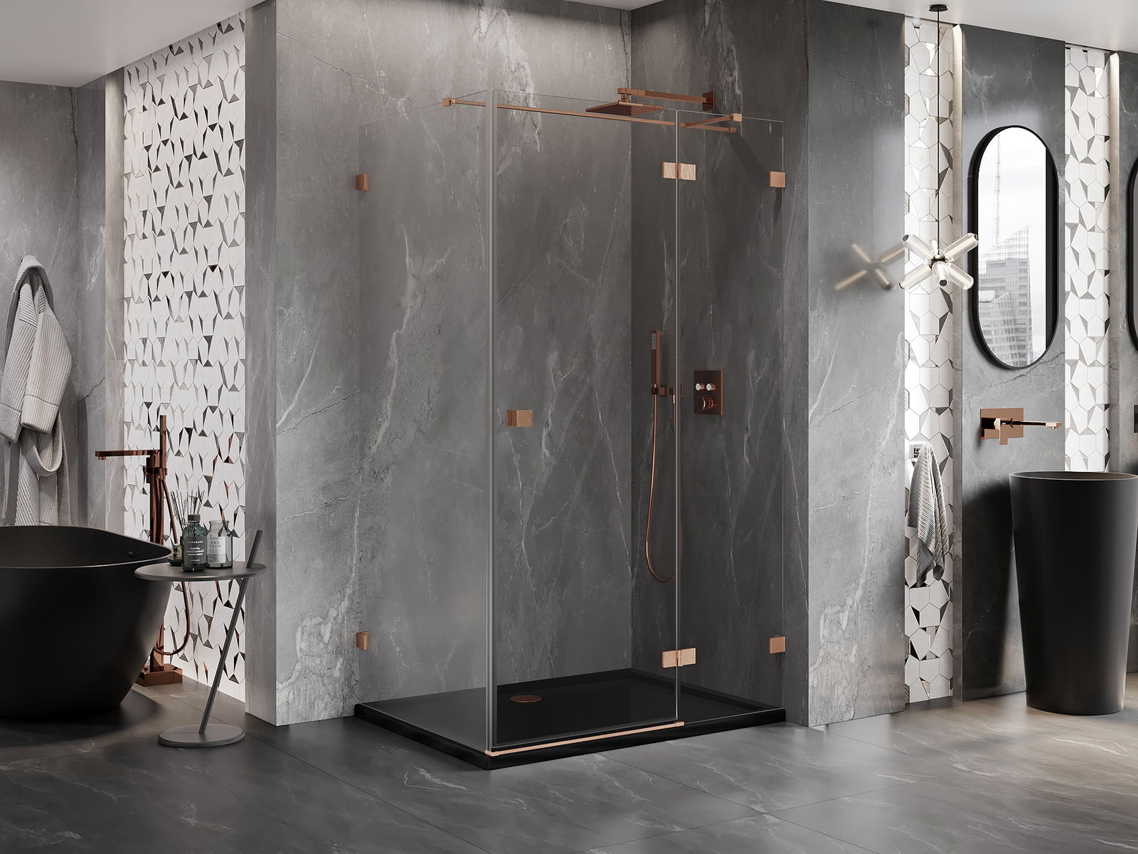Spaustukai ir vyriai pagaminti iš labai patvaraus žalvario, papildomai sukuriantys lygią stiklo plokštumą. Tai puikus pasirinkimas, jungiantis eleganciją, patvarumą ir šiuolaikinį dizainą. Tokie sprendimai prideda dušo estetikai ir tuo pačiu palengvina švaros palaikymą.