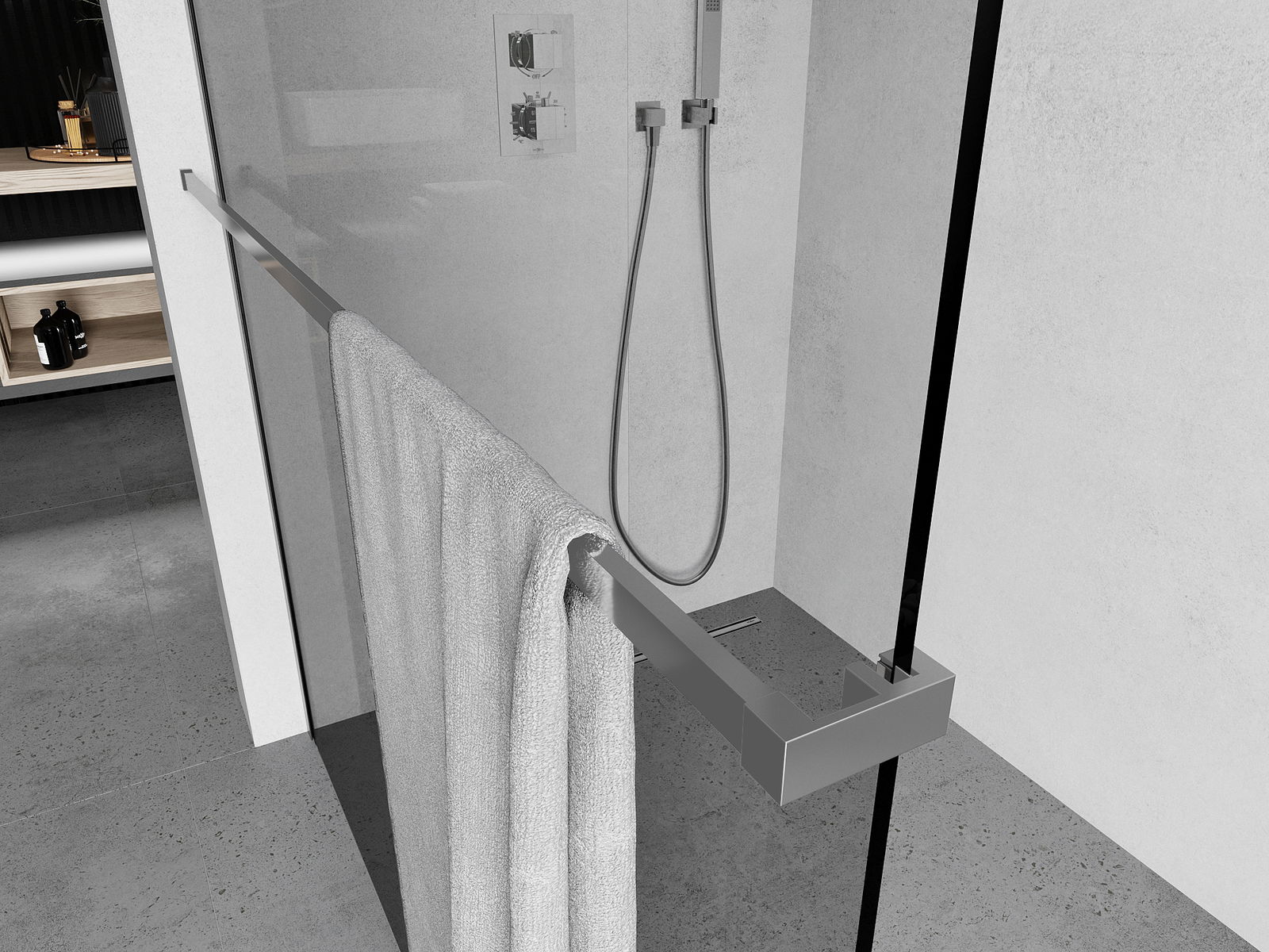 Rankšluosčių laikiklis, montuojamas prie dušo kabinos sienelės, yra praktiškas ir funkcionalus sprendimas, leidžiantis patogiai pakabinti rankšluosčius šalia maudymosi zonos, taip padidinant kasdienio naudojimo patogumą.