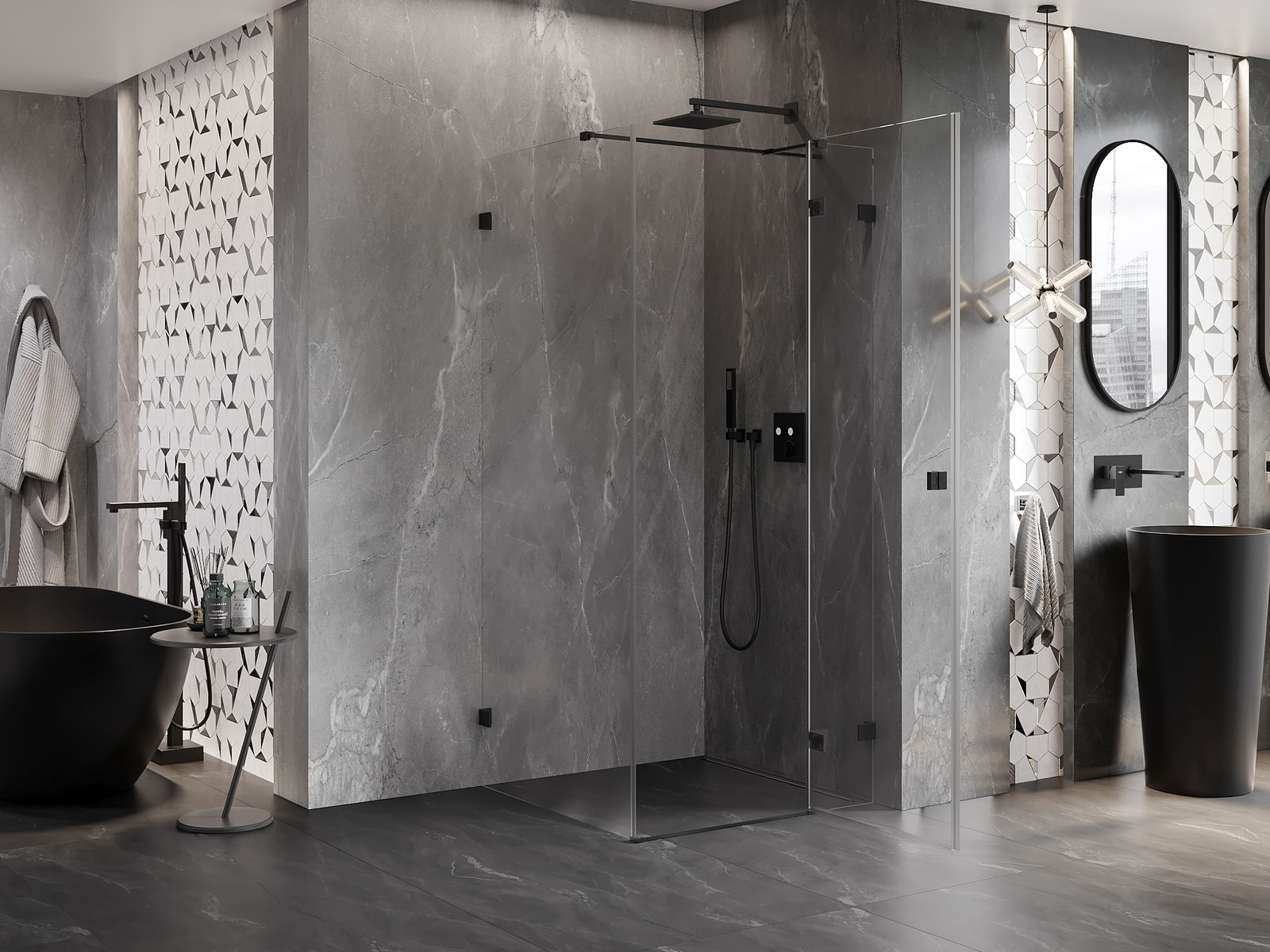 Spaustukai ir vyriai pagaminti iš labai patvaraus žalvario, papildomai sukuriantys lygią stiklo plokštumą. Tai puikus pasirinkimas, jungiantis eleganciją, patvarumą ir šiuolaikinį dizainą. Tokie sprendimai prideda dušo estetikai ir tuo pačiu palengvina švaros palaikymą.
