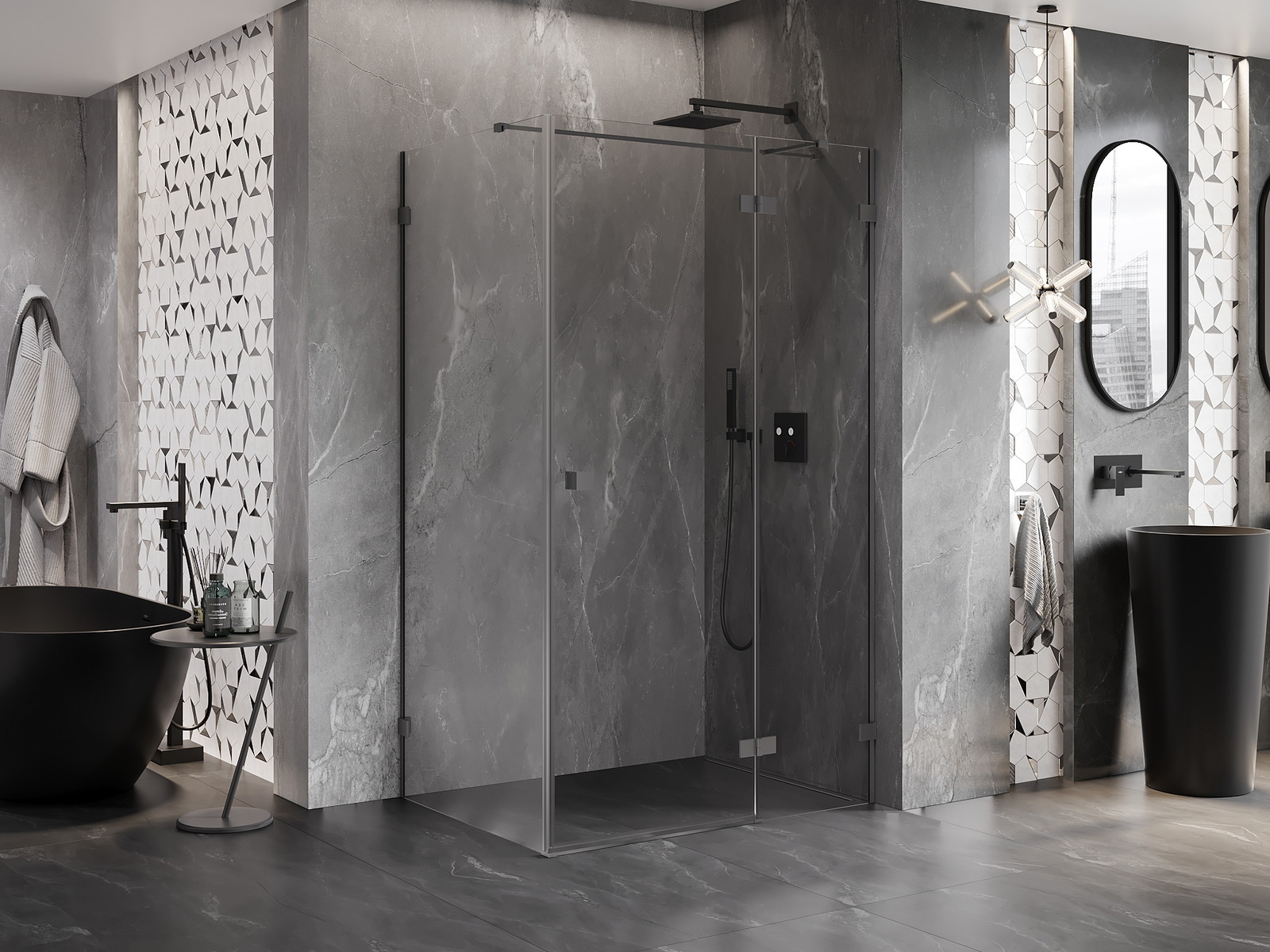 Spaustukai ir vyriai pagaminti iš labai patvaraus žalvario, papildomai sukuriantys lygią stiklo plokštumą. Tai puikus pasirinkimas, jungiantis eleganciją, patvarumą ir šiuolaikinį dizainą. Tokie sprendimai prideda dušo estetikai ir tuo pačiu palengvina švaros palaikymą.