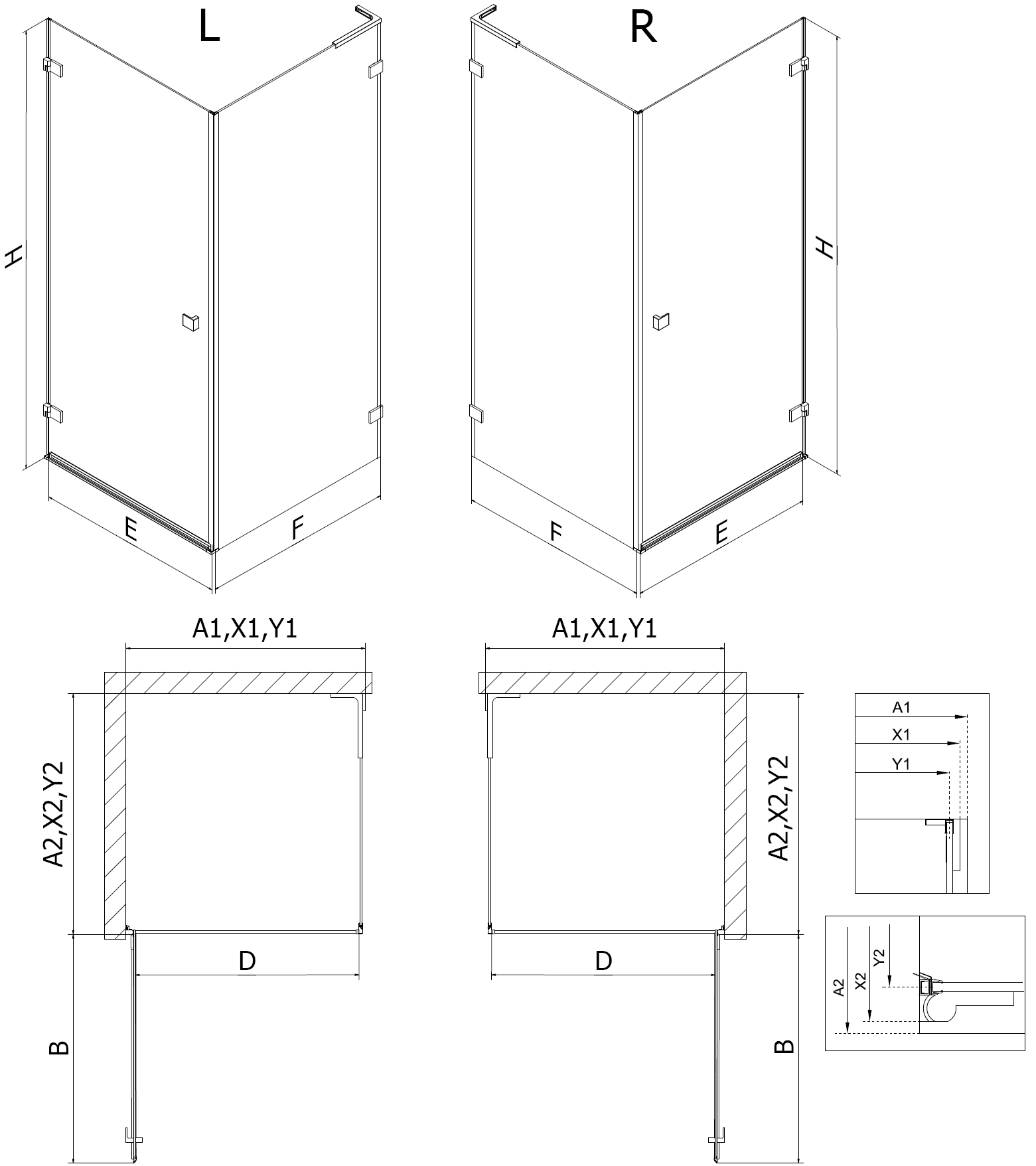 Dušo kabinos, durys ir sienelės yra standartiškai pritaikytos montuoti ant nustatytų matmenų dušo padėklų. Būtent šie matmenys nurodomi gaminio pavadinime arba aprašyme. Tačiau atkreipkite dėmesį, kad faktiniai elementų matmenys gali šiek tiek skirtis nuo vardinių verčių. Planuojant montuoti tiesiai ant grindų, rekomenduojama atidžiai patikrinti išorinius matmenis ir elementų išdėstymą pagal techninį brėžinį.