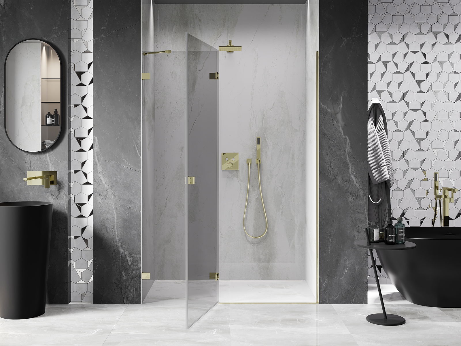 Spaustukai ir vyriai pagaminti iš labai patvaraus žalvario, papildomai sukuriantys lygią stiklo plokštumą. Tai puikus pasirinkimas, jungiantis eleganciją, patvarumą ir šiuolaikinį dizainą. Tokie sprendimai prideda dušo estetikai ir tuo pačiu palengvina švaros palaikymą.