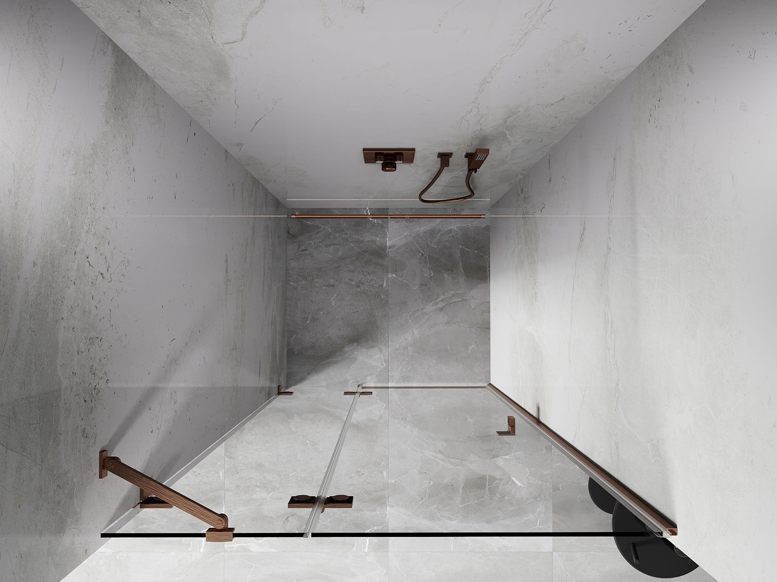Spaustukai ir vyriai pagaminti iš labai patvaraus žalvario, papildomai sukuriantys lygią stiklo plokštumą. Tai puikus pasirinkimas, jungiantis eleganciją, patvarumą ir šiuolaikinį dizainą. Tokie sprendimai prideda dušo estetikai ir tuo pačiu palengvina švaros palaikymą.