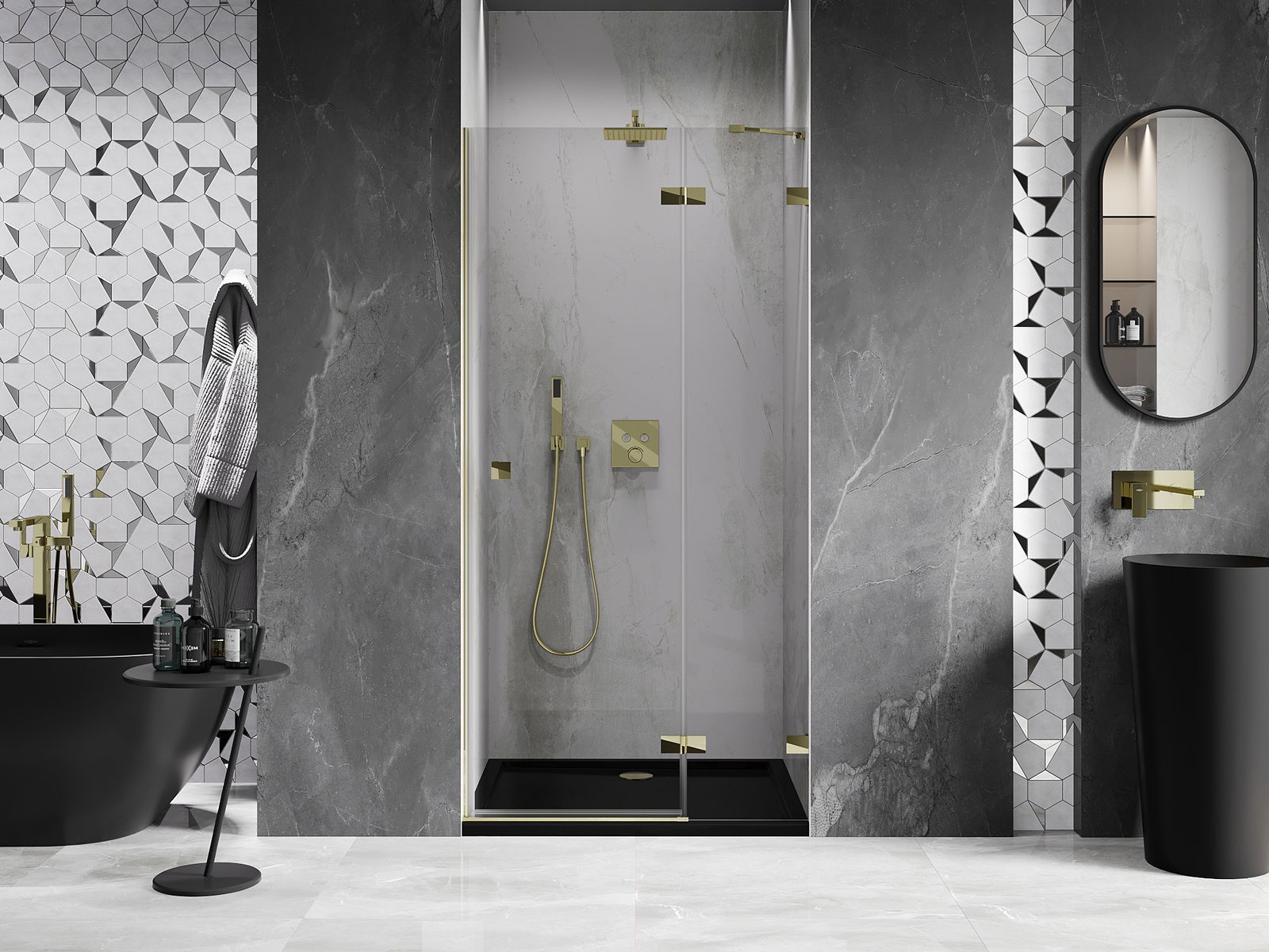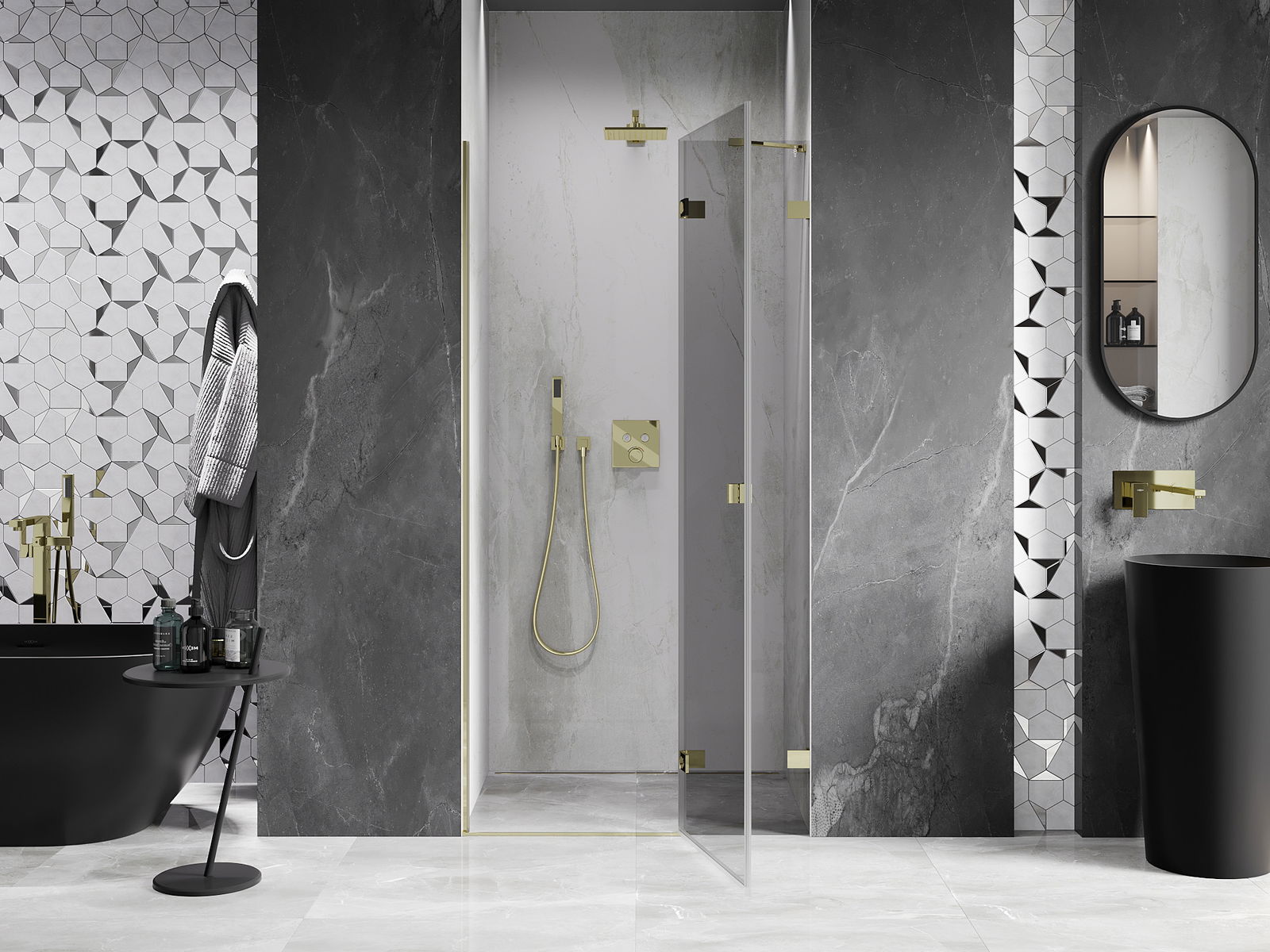 Spaustukai ir vyriai pagaminti iš labai patvaraus žalvario, papildomai sukuriantys lygią stiklo plokštumą. Tai puikus pasirinkimas, jungiantis eleganciją, patvarumą ir šiuolaikinį dizainą. Tokie sprendimai prideda dušo estetikai ir tuo pačiu palengvina švaros palaikymą.