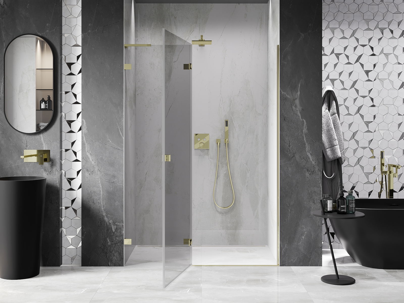 Mexen Lunar L kairės pusės atveriamos dušo durys, 130 cm, skaidrios, auksinės - 834L-130-000-50-00-L