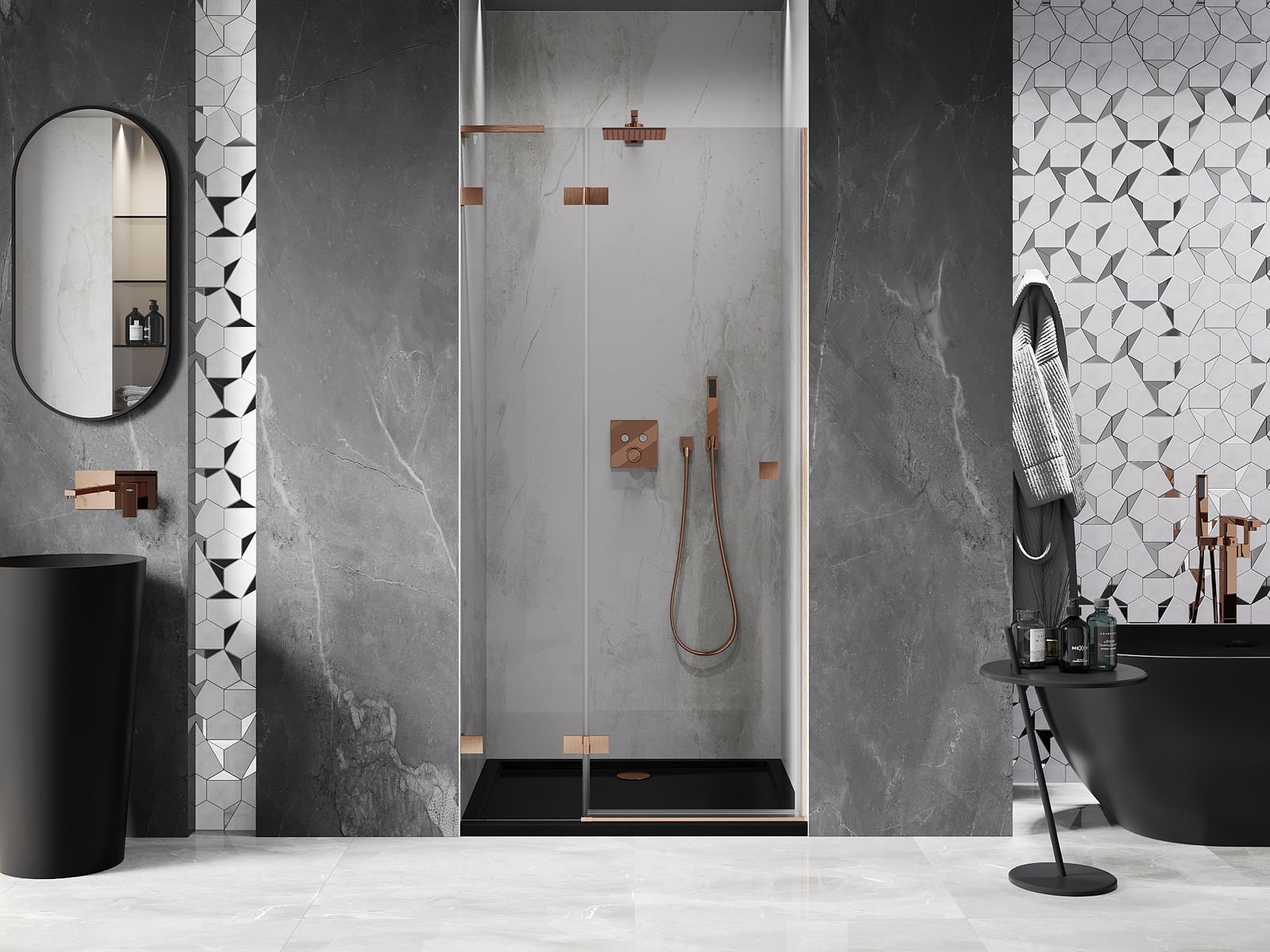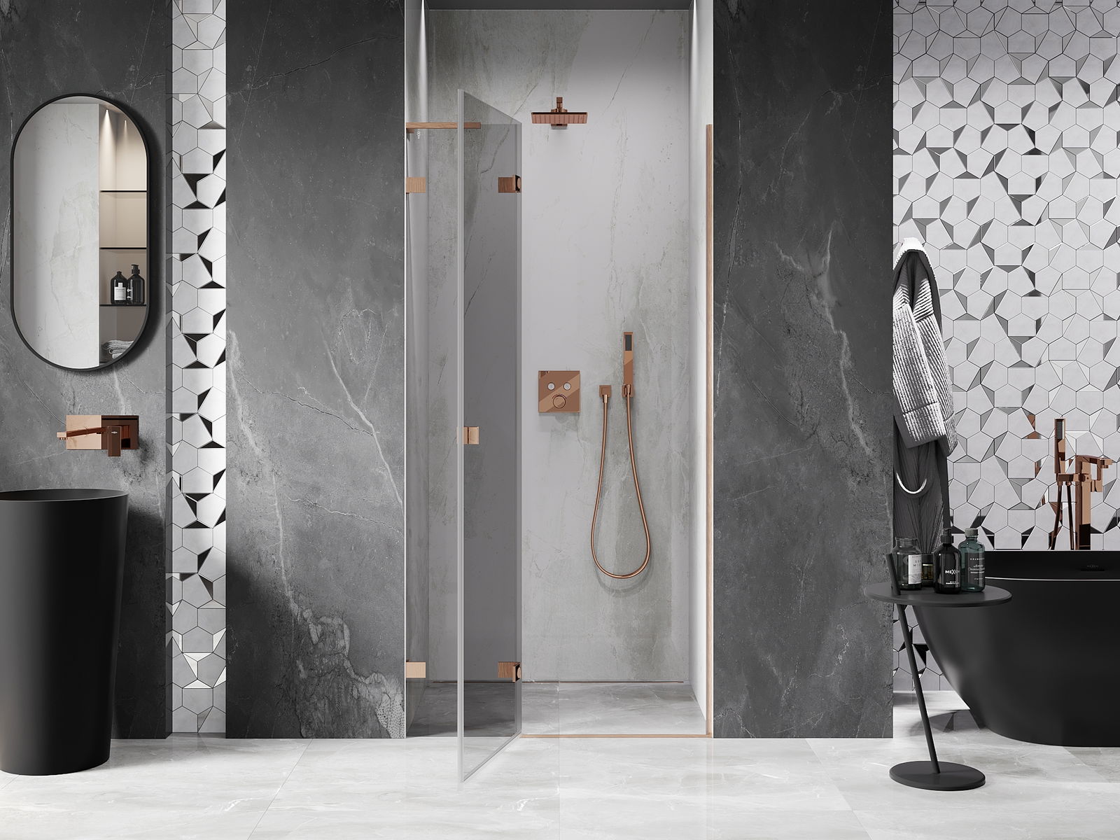 Mexen Lunar L kairiųjų šarnyrų dušo durys, 125 cm, skaidrios, šlifuota vario spalva - 834L-125-000-65-00-L