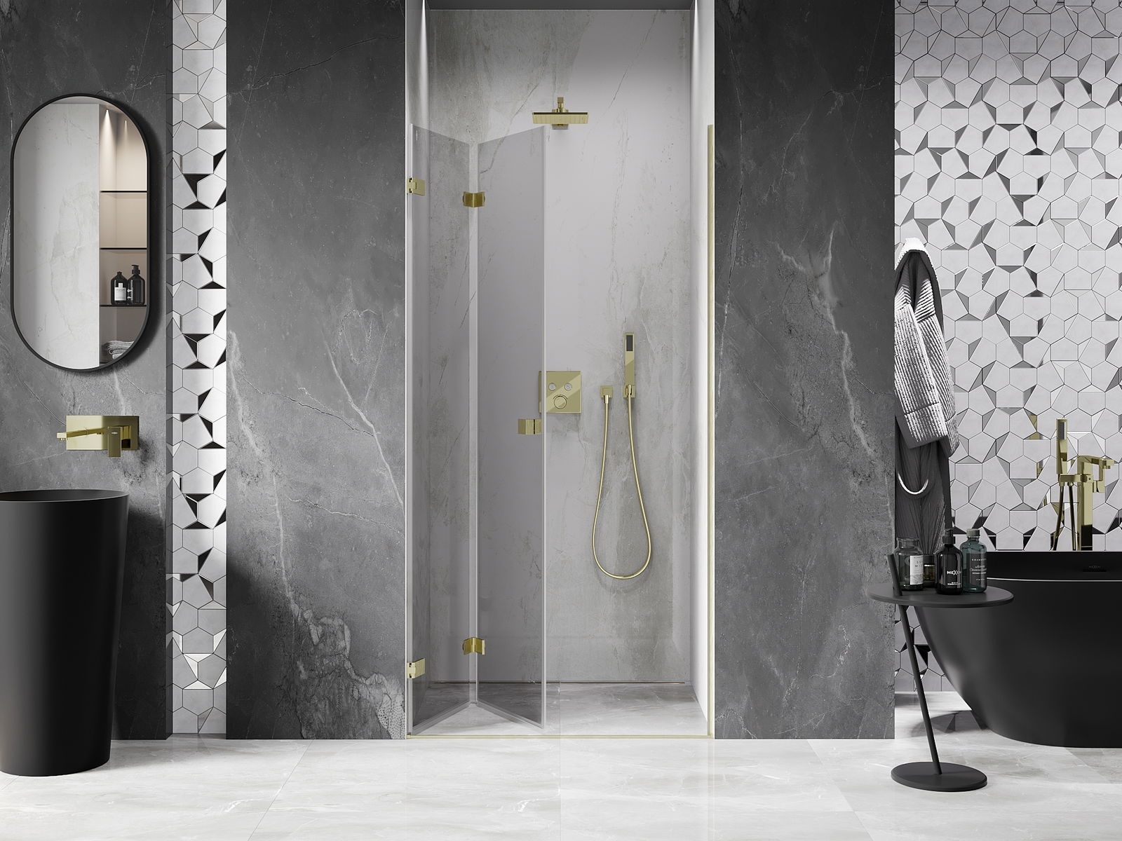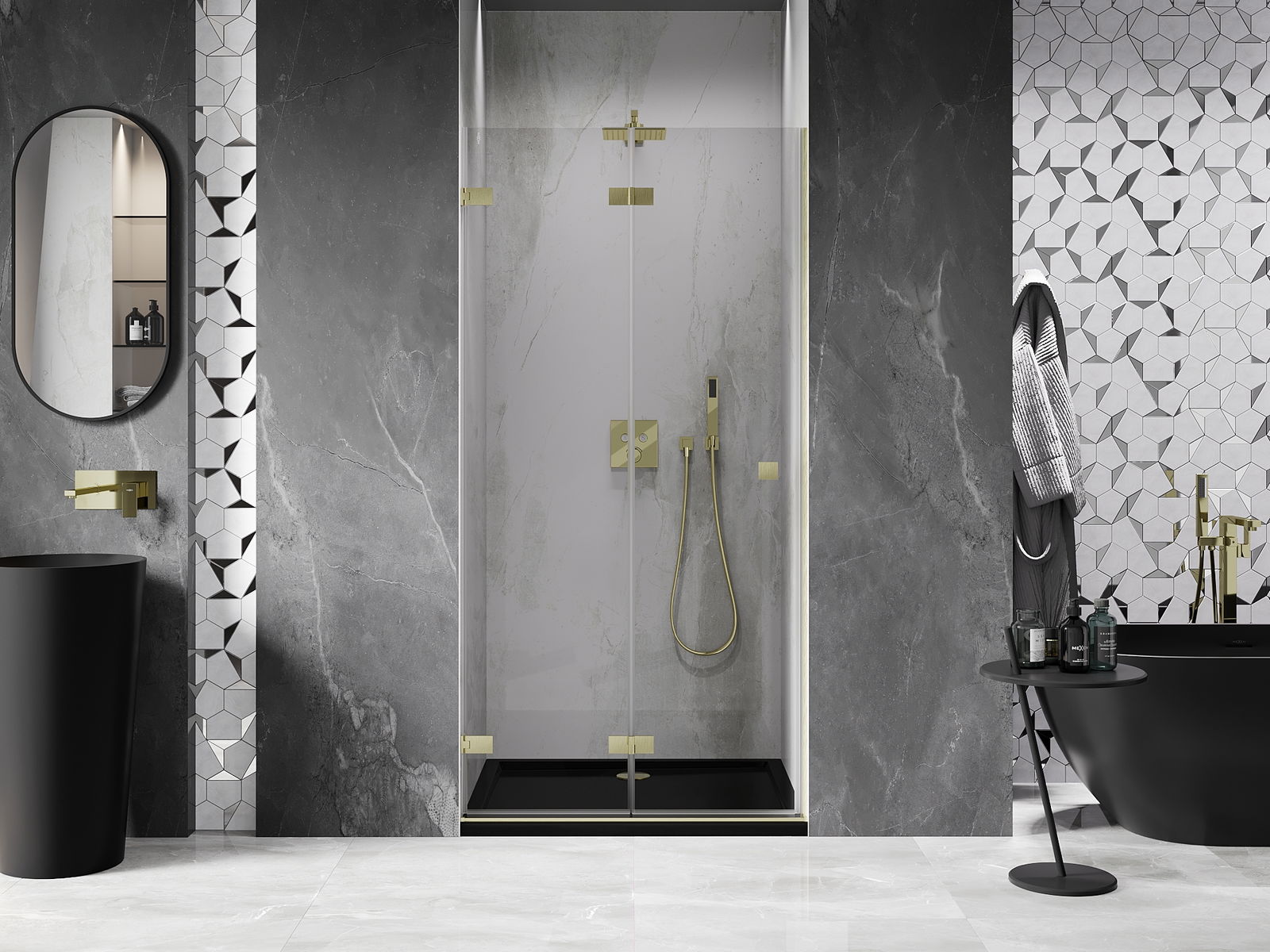 Mexen Lunar-F sulankstomos kairiosios dušo durys 65 cm, permatomos, šlifuotos auksinės - 836-065-000-55-00-L