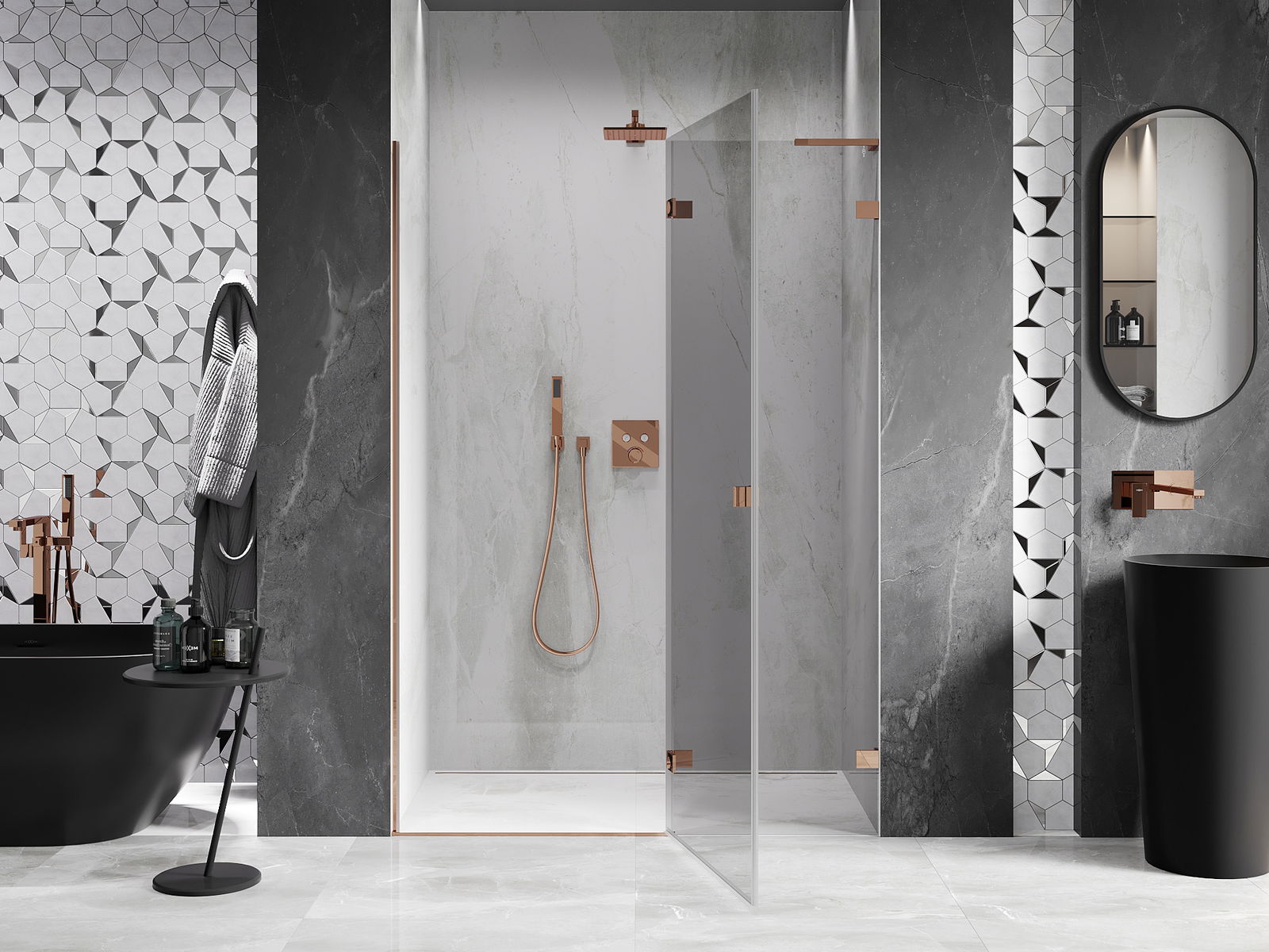 Spaustukai ir vyriai pagaminti iš labai patvaraus žalvario, papildomai sukuriantys lygią stiklo plokštumą. Tai puikus pasirinkimas, jungiantis eleganciją, patvarumą ir šiuolaikinį dizainą. Tokie sprendimai prideda dušo estetikai ir tuo pačiu palengvina švaros palaikymą.