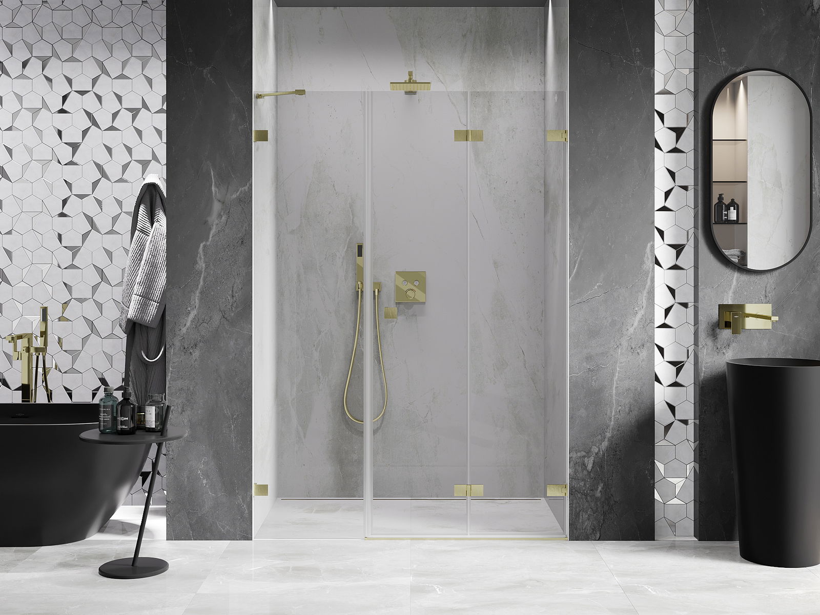 Mexen Lunar-F sulankstomos dešinės dušo durys 130 cm, permatomos, auksinės šukuotos - 836S-130-050-55-00-P