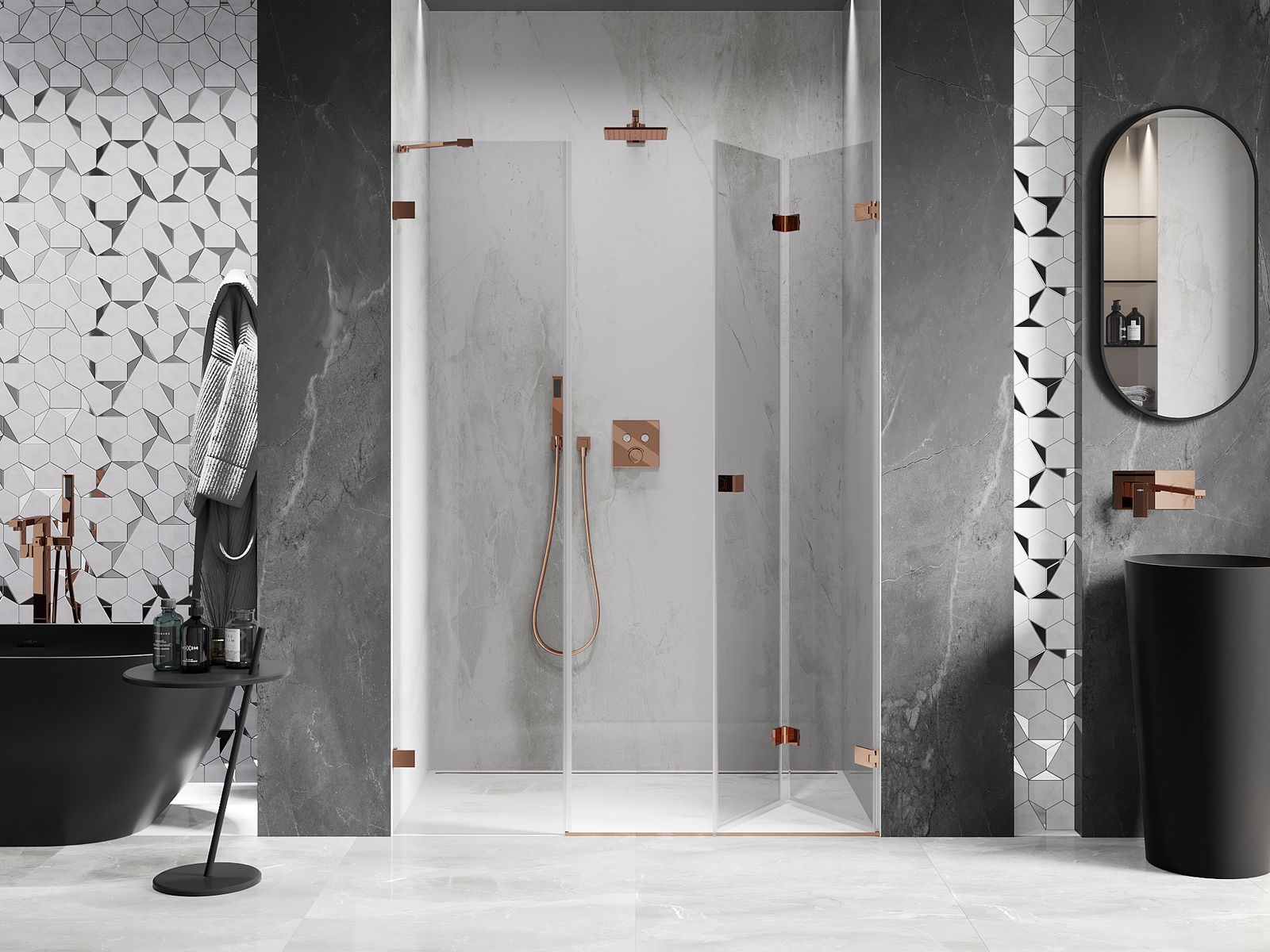 Mexen Lunar-F sulankstomos dešinės dušo durys 140 cm, permatomos, rausvas auksas - 836S-140-050-60-00-P