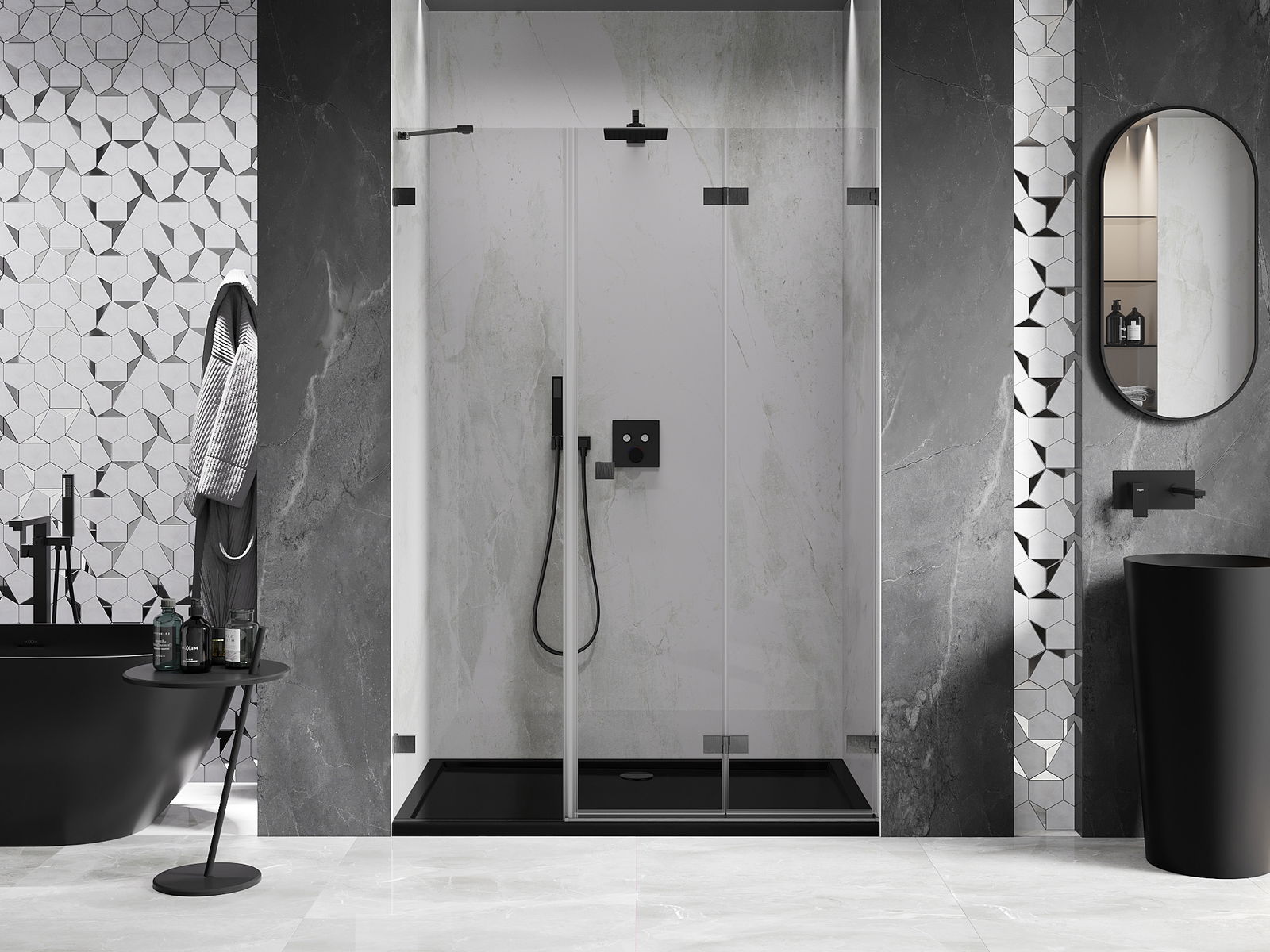 Galimybė sulenkti duris, tiek į išorę, tiek į vidų, leidžia gauti daugiau erdvės nenaudojant dušo. Tai yra idealus sprendimas mažesnėms vonios kambariams, maksimaliai išnaudojantis turimą plotą.