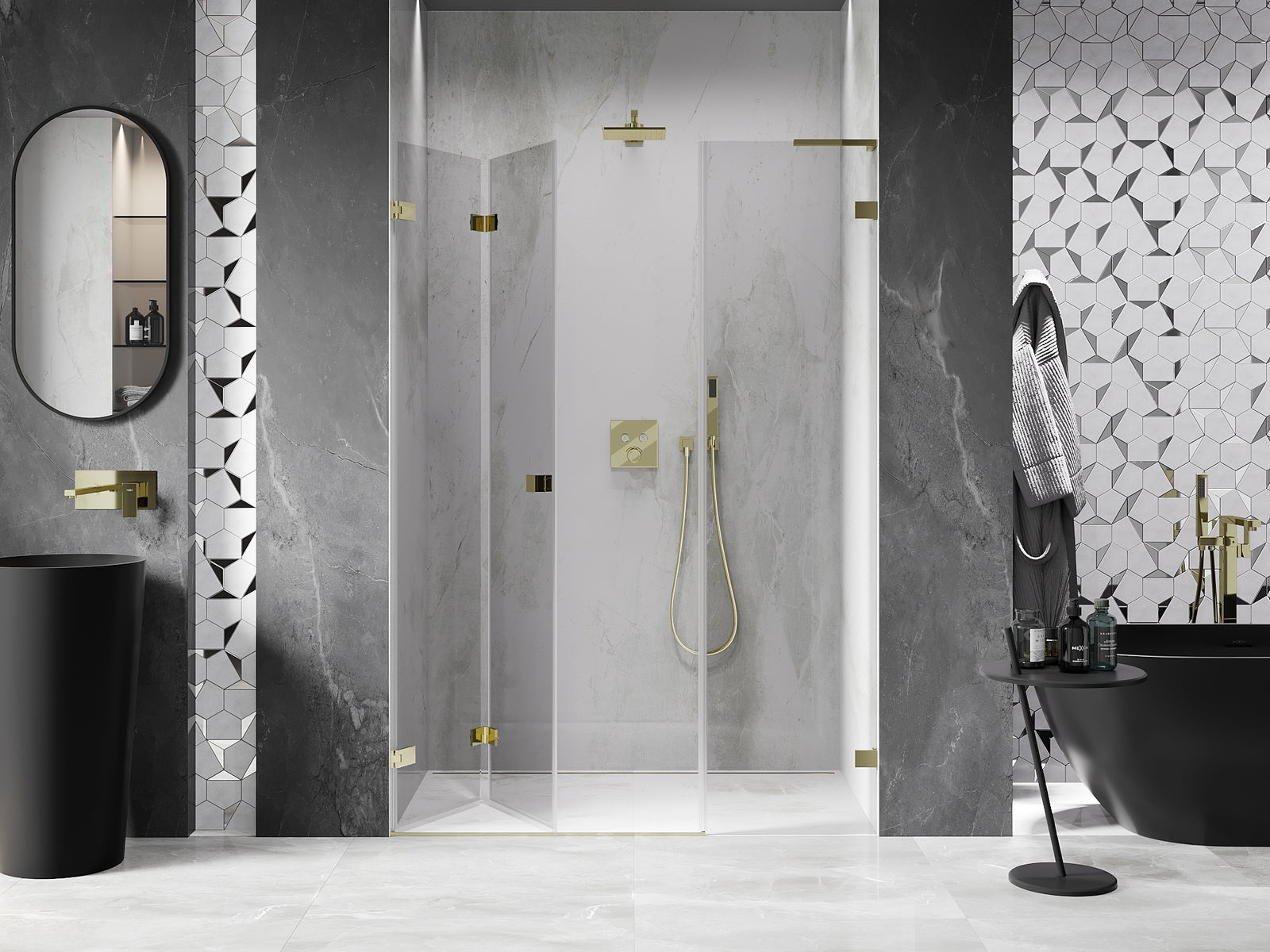 Galimybė sulenkti duris, tiek į išorę, tiek į vidų, leidžia gauti daugiau erdvės nenaudojant dušo. Tai yra idealus sprendimas mažesnėms vonios kambariams, maksimaliai išnaudojantis turimą plotą.