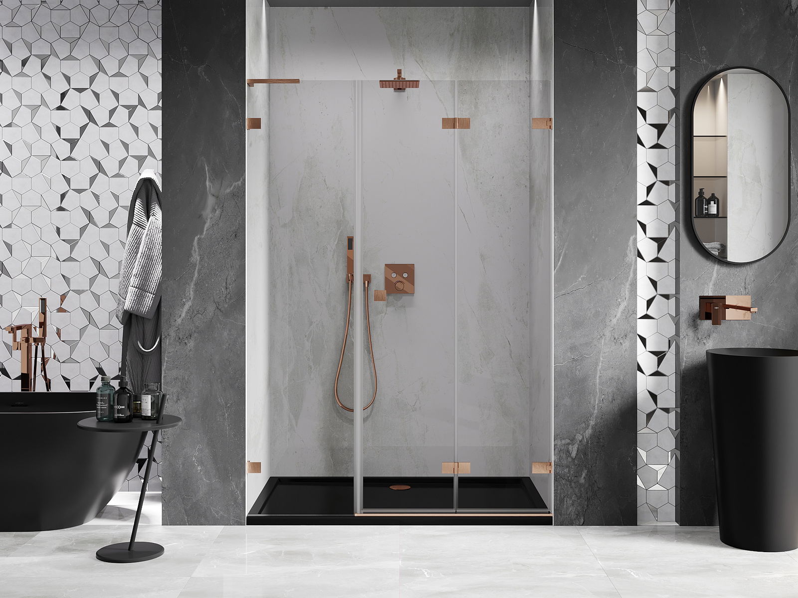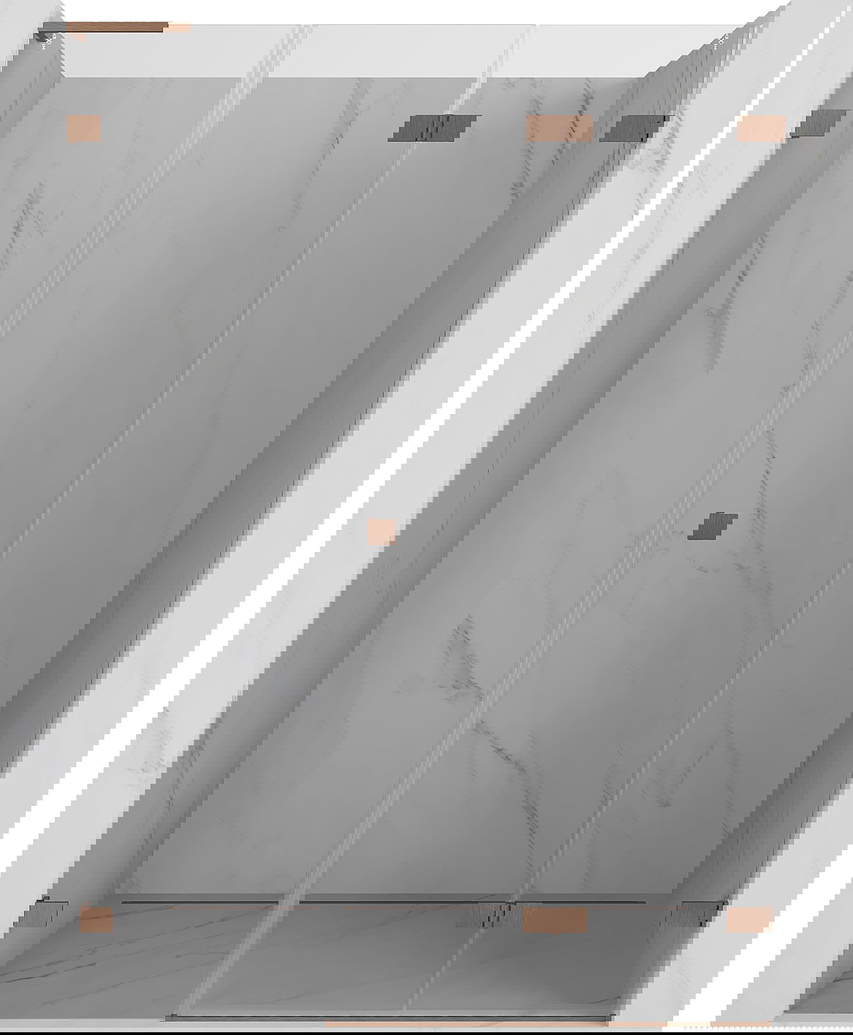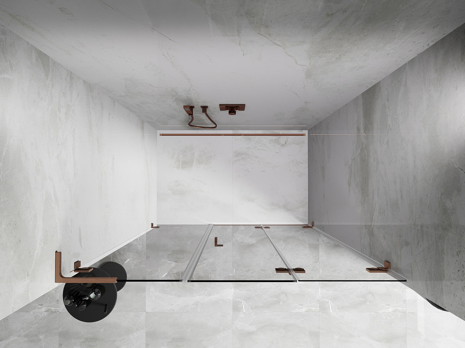 Spaustukai ir vyriai pagaminti iš labai patvaraus žalvario, papildomai sukuriantys lygią stiklo plokštumą. Tai puikus pasirinkimas, jungiantis eleganciją, patvarumą ir šiuolaikinį dizainą. Tokie sprendimai prideda dušo estetikai ir tuo pačiu palengvina švaros palaikymą.