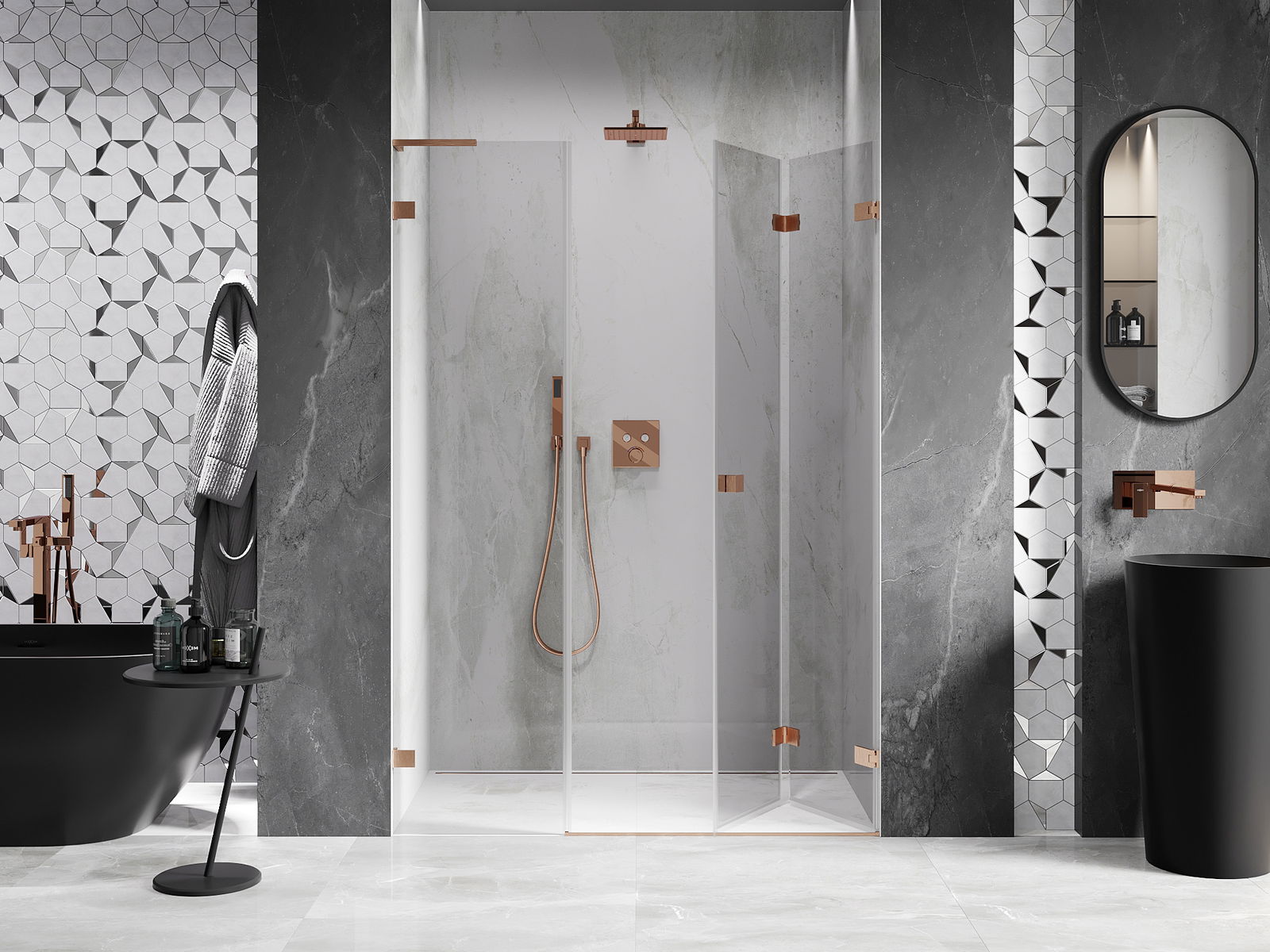 Galimybė sulenkti duris, tiek į išorę, tiek į vidų, leidžia gauti daugiau erdvės nenaudojant dušo. Tai yra idealus sprendimas mažesnėms vonios kambariams, maksimaliai išnaudojantis turimą plotą.