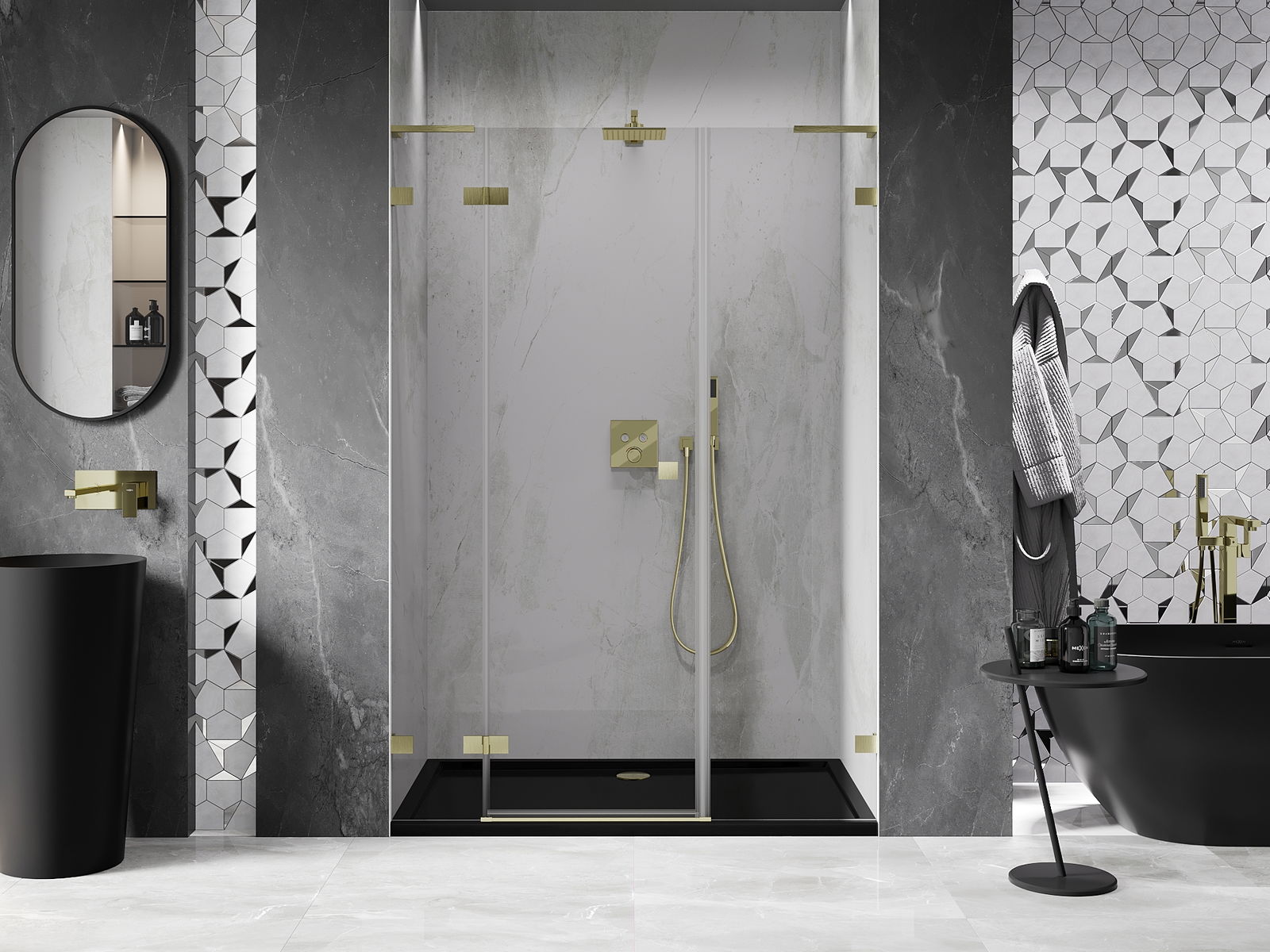 Spaustukai ir vyriai pagaminti iš labai patvaraus žalvario, papildomai sukuriantys lygią stiklo plokštumą. Tai puikus pasirinkimas, jungiantis eleganciją, patvarumą ir šiuolaikinį dizainą. Tokie sprendimai prideda dušo estetikai ir tuo pačiu palengvina švaros palaikymą.