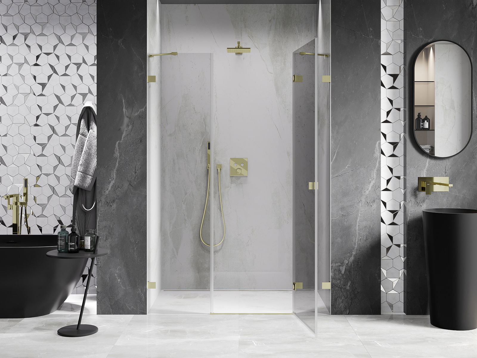 Spaustukai ir vyriai pagaminti iš labai patvaraus žalvario, papildomai sukuriantys lygią stiklo plokštumą. Tai puikus pasirinkimas, jungiantis eleganciją, patvarumą ir šiuolaikinį dizainą. Tokie sprendimai prideda dušo estetikai ir tuo pačiu palengvina švaros palaikymą.