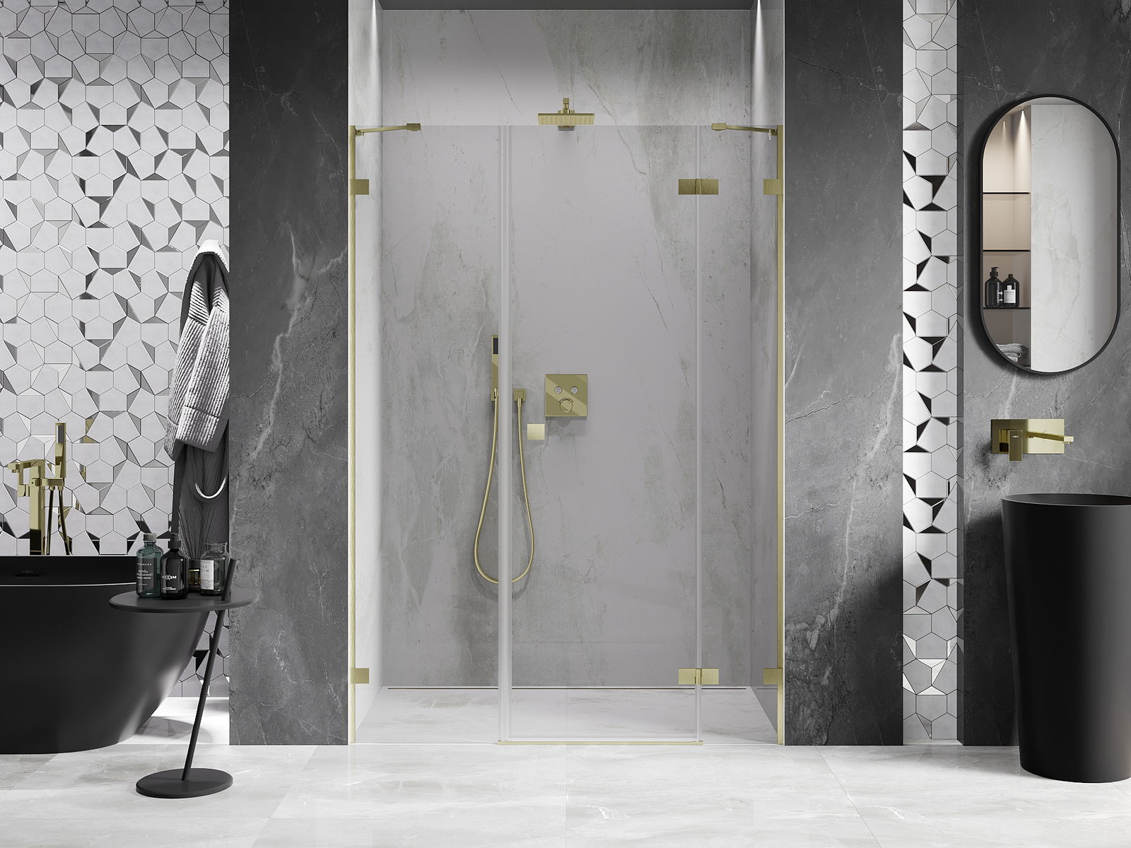 Spaustukai ir vyriai pagaminti iš labai patvaraus žalvario, papildomai sukuriantys lygią stiklo plokštumą. Tai puikus pasirinkimas, jungiantis eleganciją, patvarumą ir šiuolaikinį dizainą. Tokie sprendimai prideda dušo estetikai ir tuo pačiu palengvina švaros palaikymą.