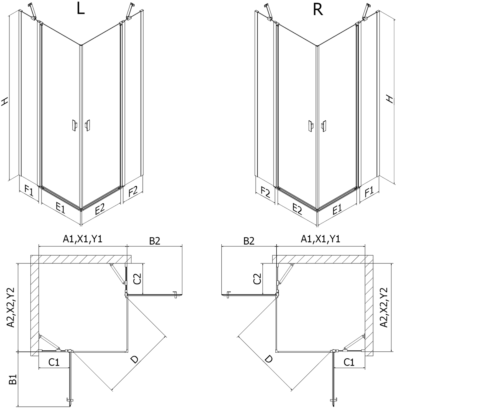 Dušo kabinos, durys ir sienelės yra standartiškai pritaikytos montuoti ant nustatytų matmenų dušo padėklų. Būtent šie matmenys nurodomi gaminio pavadinime arba aprašyme. Tačiau atkreipkite dėmesį, kad faktiniai elementų matmenys gali šiek tiek skirtis nuo vardinių verčių. Planuojant montuoti tiesiai ant grindų, rekomenduojama atidžiai patikrinti išorinius matmenis ir elementų išdėstymą pagal techninį brėžinį.