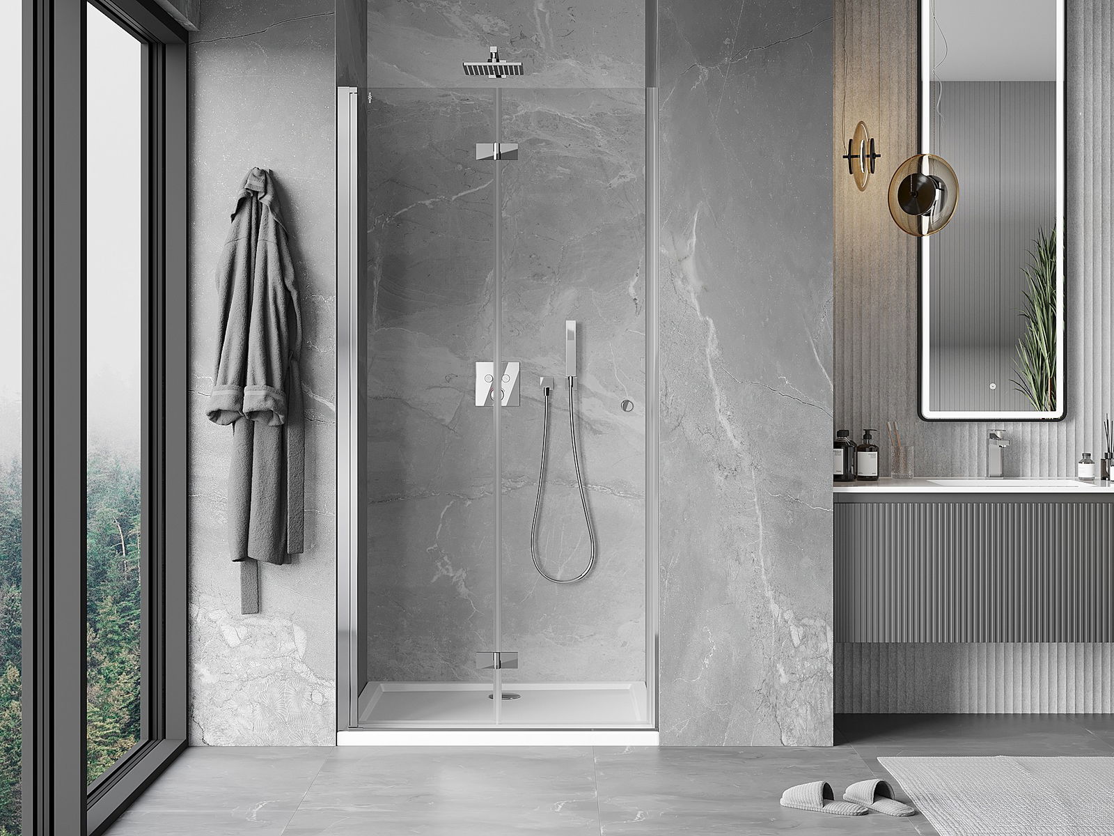 Galimybė sulenkti duris, tiek į išorę, tiek į vidų, leidžia gauti daugiau erdvės nenaudojant dušo. Tai yra idealus sprendimas mažesnėms vonios kambariams, maksimaliai išnaudojantis turimą plotą.