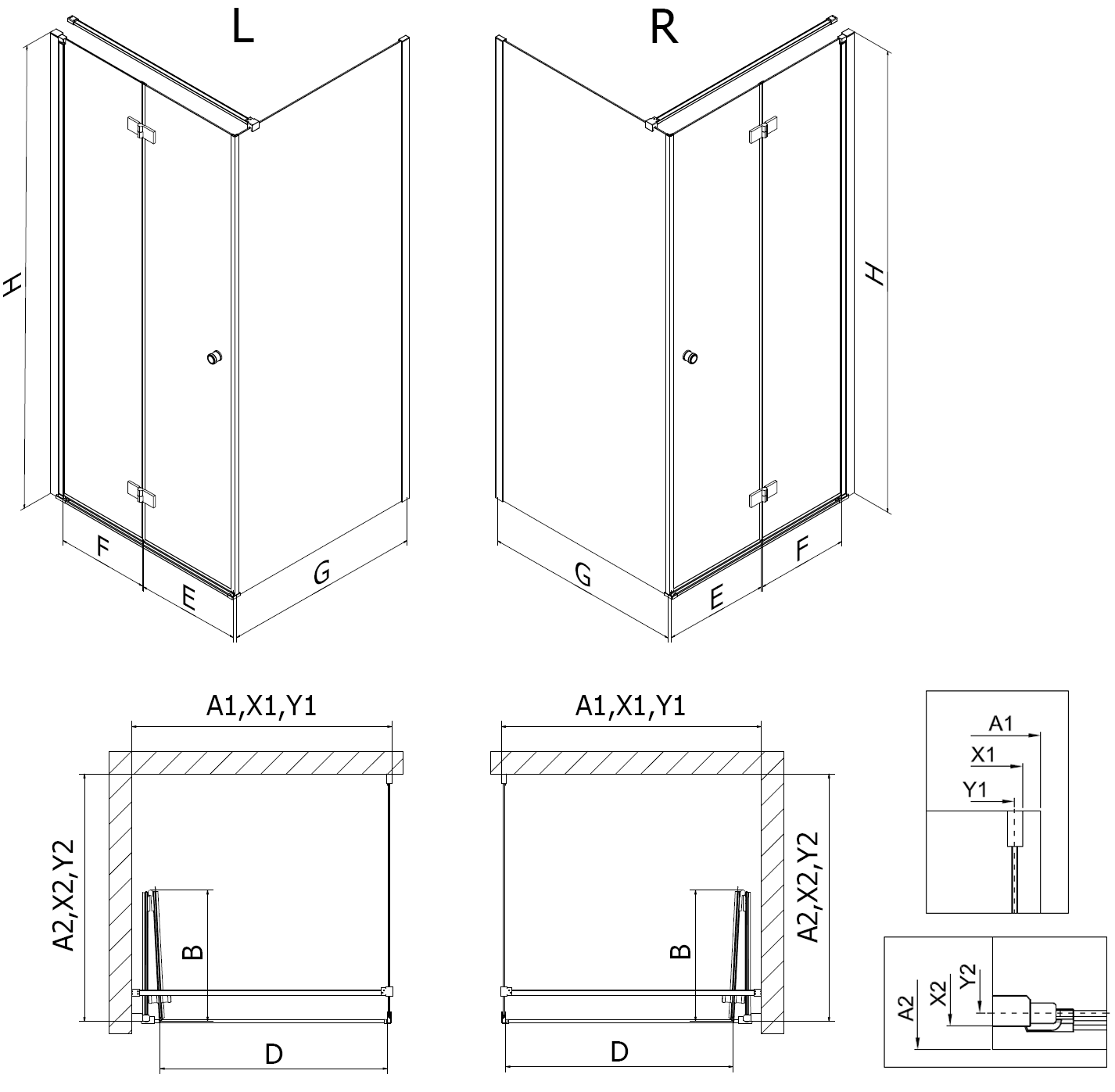 Dušo kabinos, durys ir sienelės yra standartiškai pritaikytos montuoti ant nustatytų matmenų dušo padėklų. Būtent šie matmenys nurodomi gaminio pavadinime arba aprašyme. Tačiau atkreipkite dėmesį, kad faktiniai elementų matmenys gali šiek tiek skirtis nuo vardinių verčių. Planuojant montuoti tiesiai ant grindų, rekomenduojama atidžiai patikrinti išorinius matmenis ir elementų išdėstymą pagal techninį brėžinį.