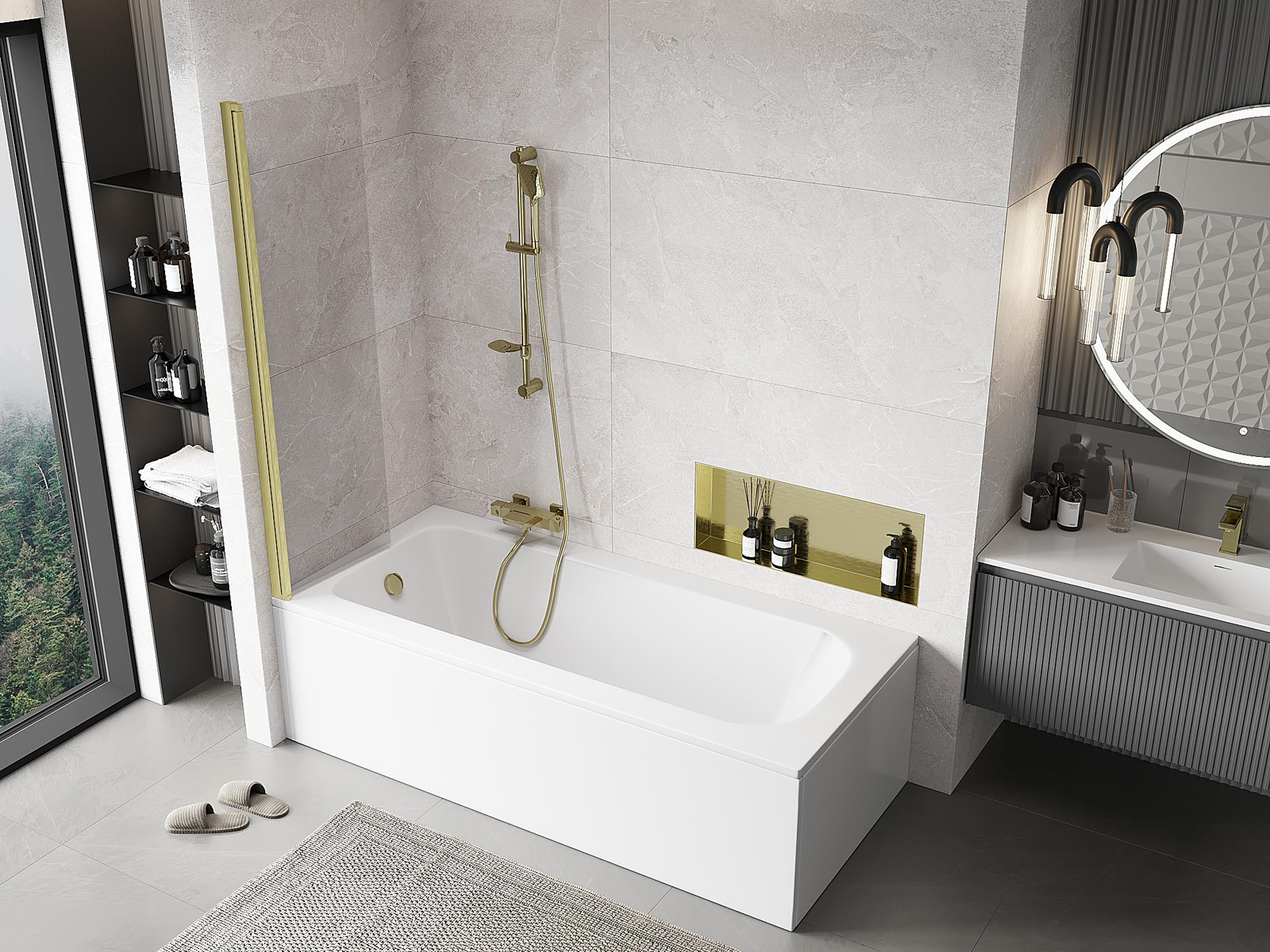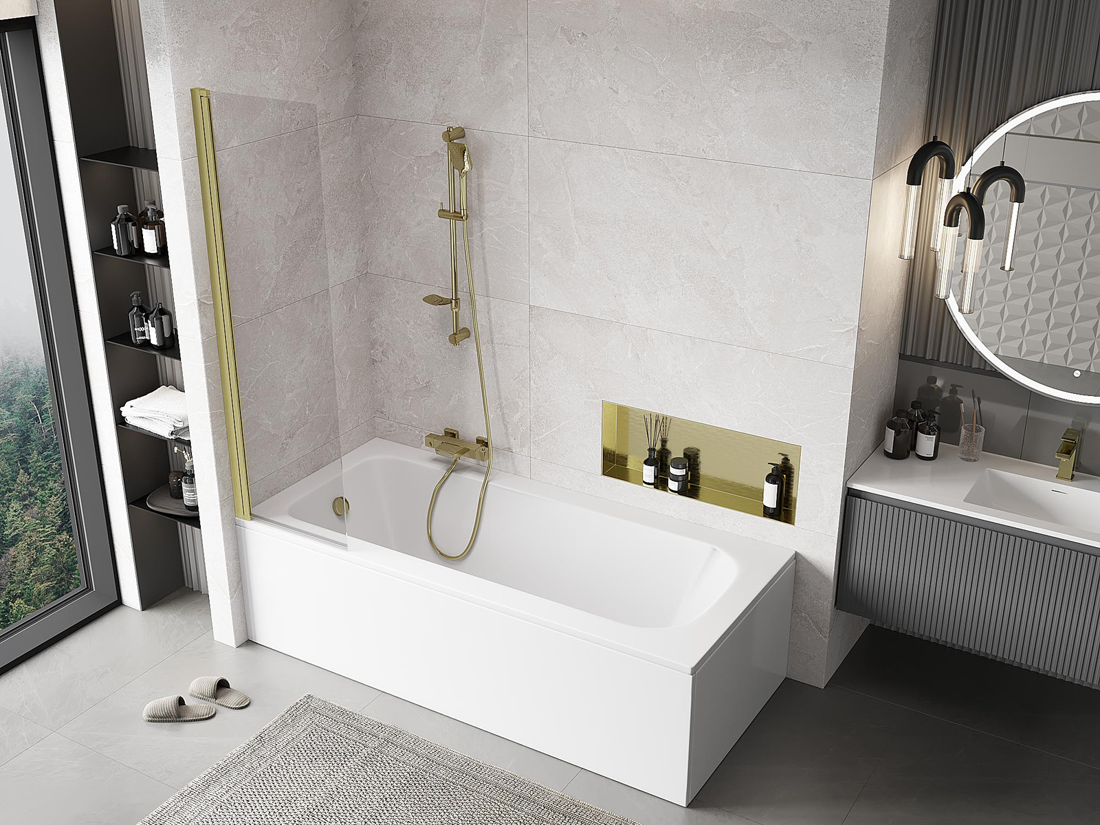 Efektyvi apsauga nuo vandens išsiliejimo maudymosi metu. Sienelė turi tarpines, kurios idealiai priglunda prie stiklo paviršiaus ir vonios krašto. Funkcionalus sprendimas, užtikrinantis saugumą ir lengvą švaros palaikymą.