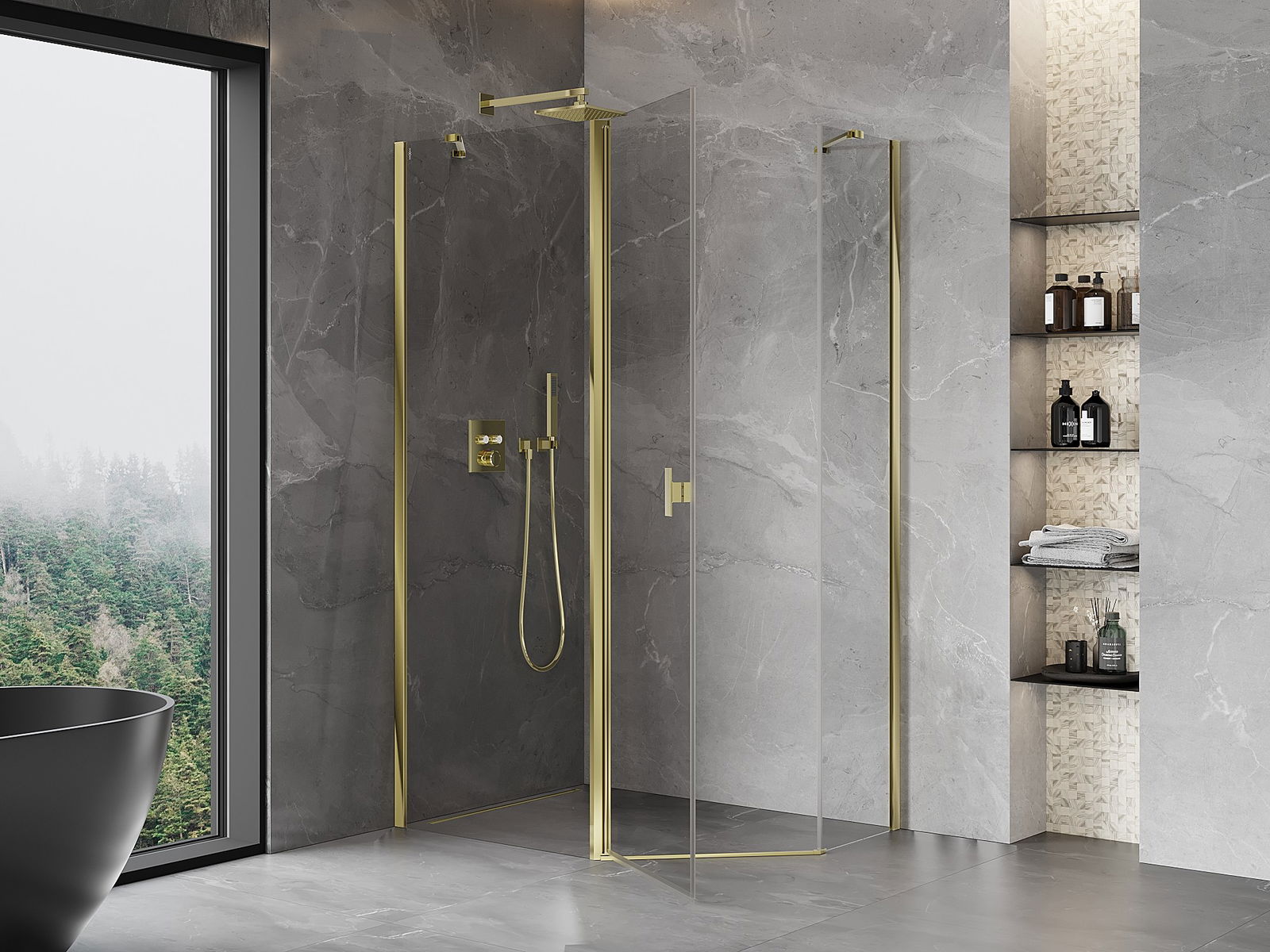Mexen Mist penkiakampė asimetrinė dušo kabina varstomomis durimis 100 x 90 cm, skaidri, auksinė - 8A8-100-090-50-00