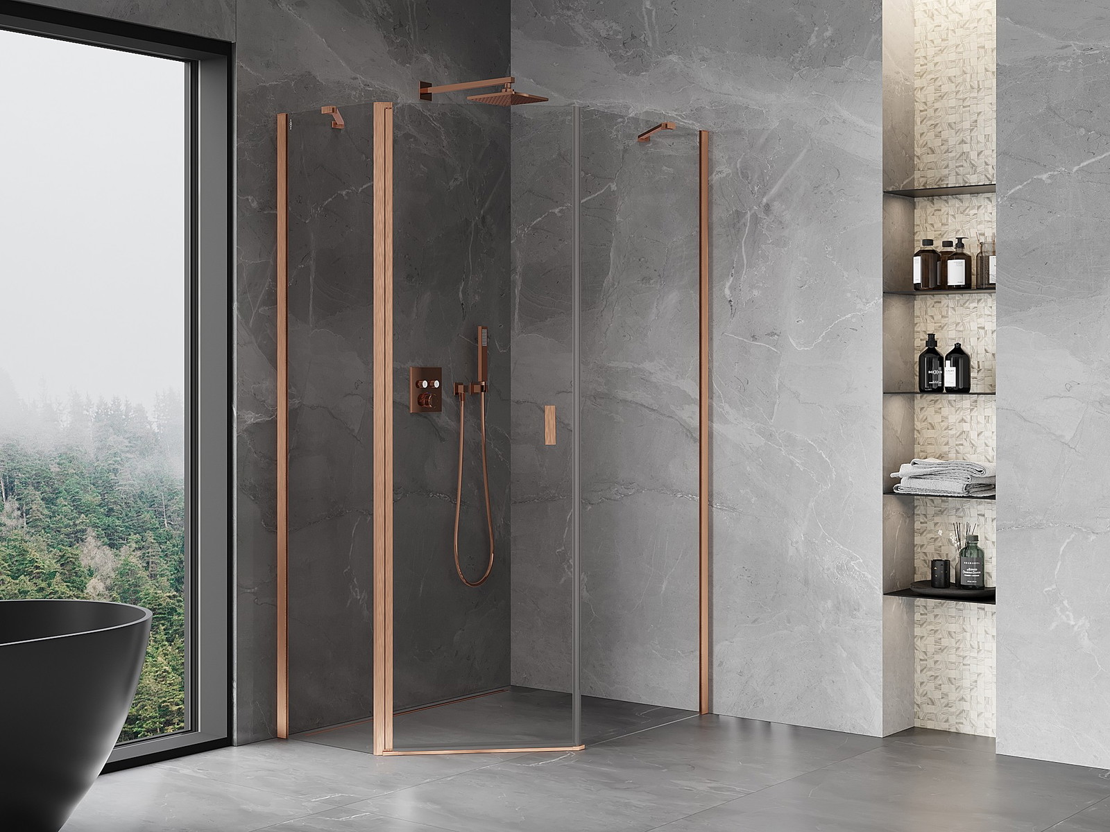 Mexen Mist asimetriška penkiakampė dušo kabina su atveriamomis durimis 90 x 100 cm, skaidrus, šlifuotas varis