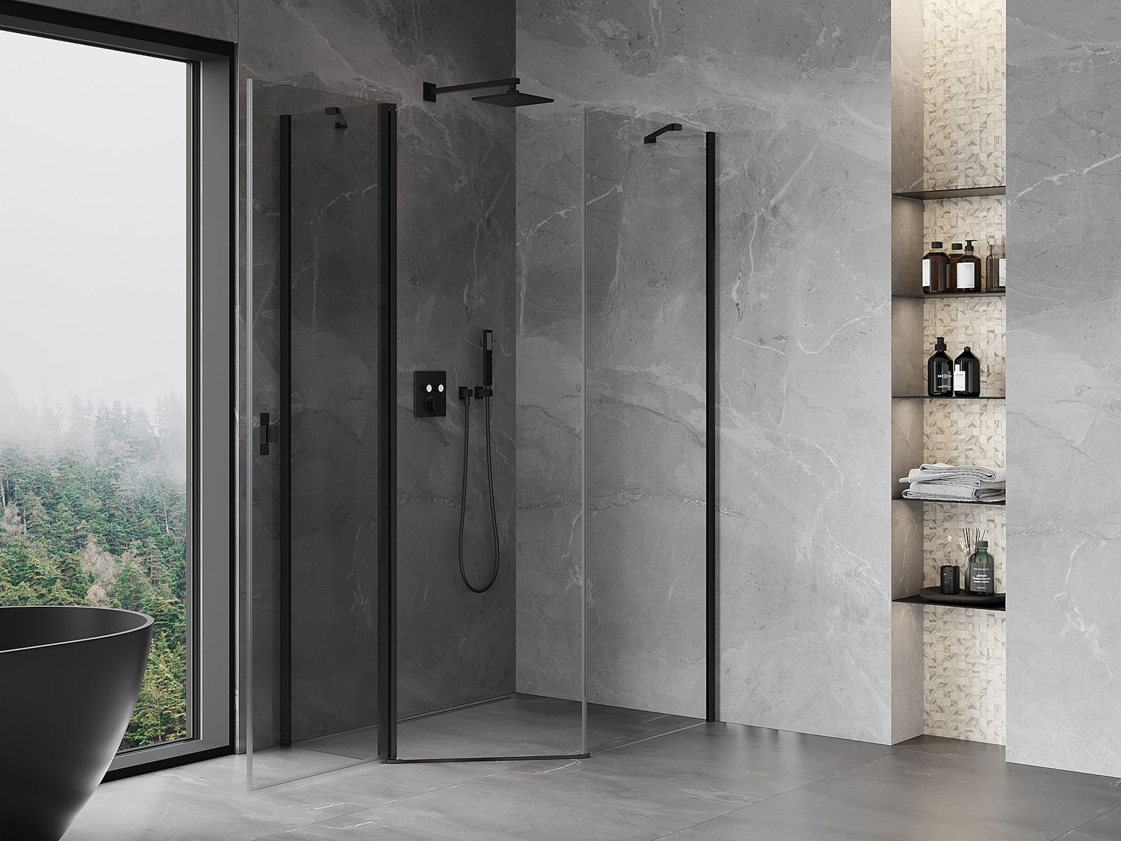 Mexen Mist asimetrinė penkiakampė dušo kabina su varstomomis durimis 90 x 100 cm, skaidri, juoda - 8A8-090-100-70-00