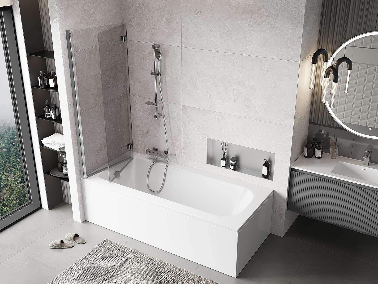 Efektyvi apsauga nuo vandens išsiliejimo maudymosi metu. Sienelė turi tarpines, kurios idealiai priglunda prie stiklo paviršiaus ir vonios krašto. Funkcionalus sprendimas, užtikrinantis saugumą ir lengvą švaros palaikymą.