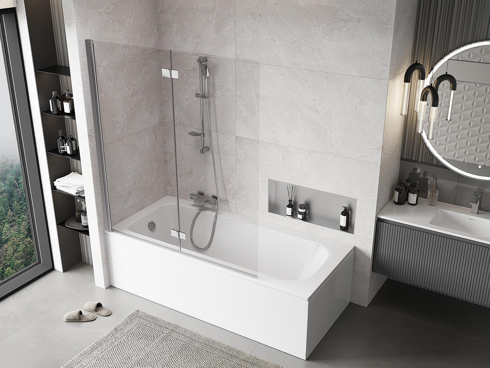 Efektyvi apsauga nuo vandens išsiliejimo maudymosi metu. Sienelė turi tarpines, kurios idealiai priglunda prie stiklo paviršiaus ir vonios krašto. Funkcionalus sprendimas, užtikrinantis saugumą ir lengvą švaros palaikymą.