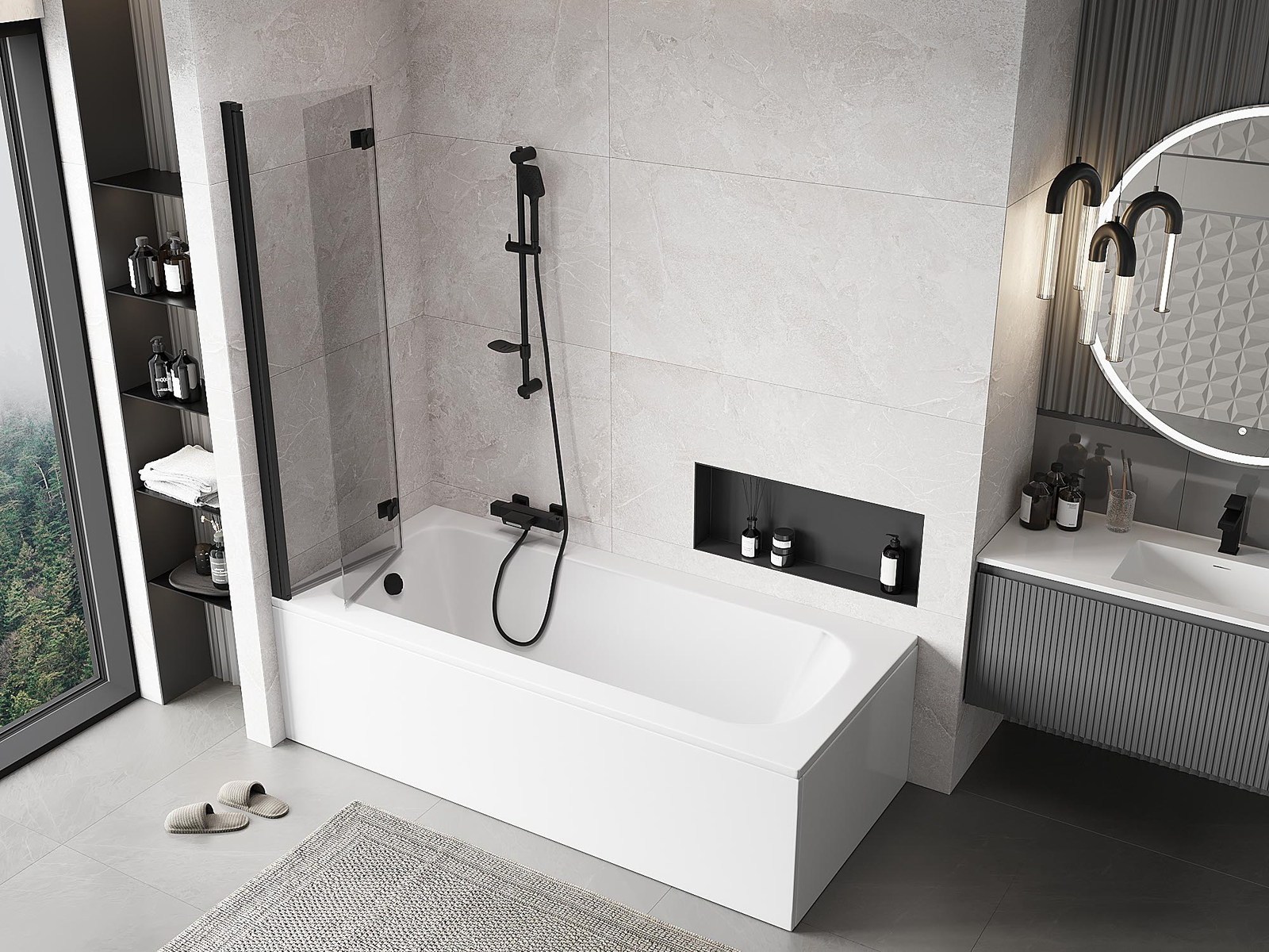 Efektyvi apsauga nuo vandens išsiliejimo maudymosi metu. Sienelė turi tarpines, kurios idealiai priglunda prie stiklo paviršiaus ir vonios krašto. Funkcionalus sprendimas, užtikrinantis saugumą ir lengvą švaros palaikymą.