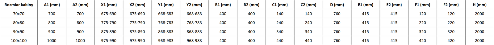 Dušo kabinos, durys ir sienelės yra standartiškai pritaikytos montuoti ant nustatytų matmenų dušo padėklų. Būtent šie matmenys nurodomi gaminio pavadinime arba aprašyme. Tačiau atkreipkite dėmesį, kad faktiniai elementų matmenys gali šiek tiek skirtis nuo vardinių verčių. Planuojant montuoti tiesiai ant grindų, rekomenduojama atidžiai patikrinti išorinius matmenis ir elementų išdėstymą pagal techninį brėžinį.