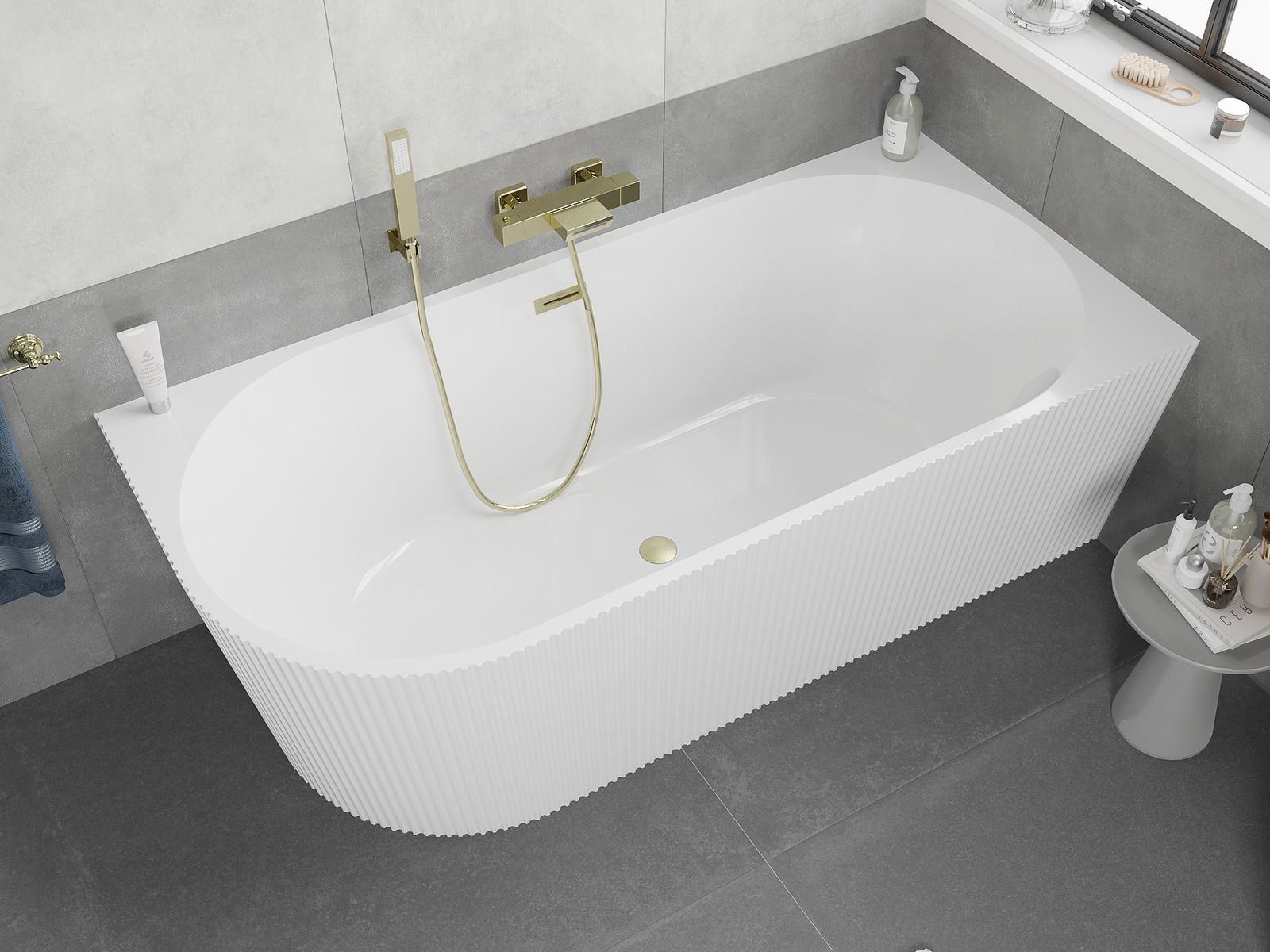 Mexen Silo laisvai pastatoma dešinė kampinė rifliuota vonia 150 x 75 cm, balta, auksinis šepetėliu peršokimas