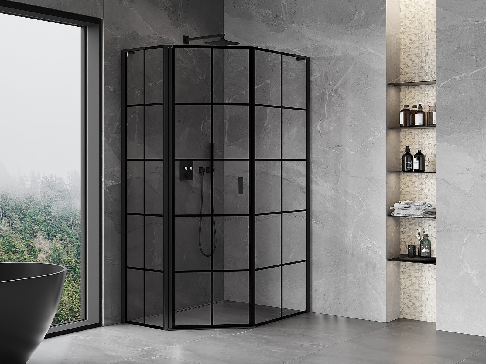 Mexen Mist L penkiakampė asimetrinė dušo kabina, kairė 80 x 100 cm, juodas tinklelis, juoda - 8A8L-080-100-70-77-L