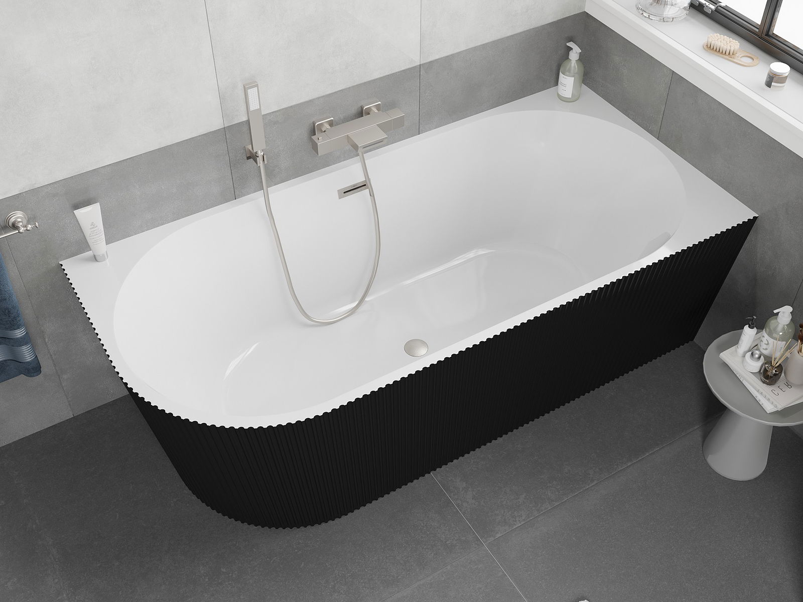Mexen Silo laisvai pastatoma kampinė dešinė rifliuota vonia 150 x 75 cm, balta/juoda, matinė nikelio perpildymo